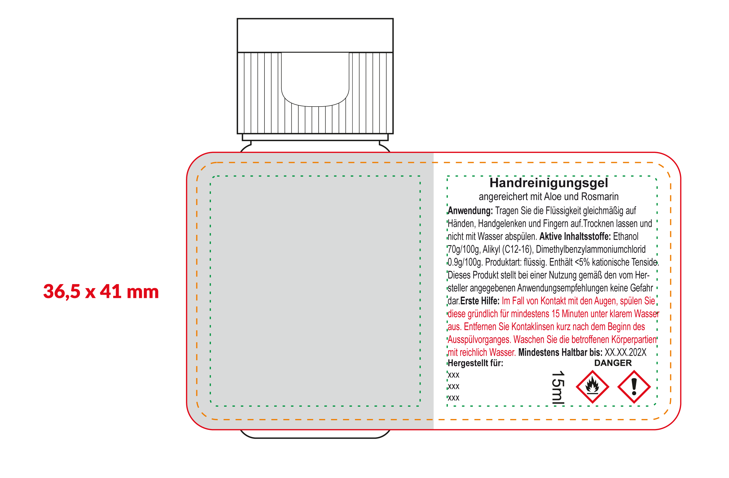 15 ml PET Flasche (kristallklar) mit Klappdeckel. Leicht zu öffnen und sauber wieder zu verschließen. Das Handgel für die Hände ist der ideale Begleiter im Alltag. Ohne Wasser anwendbar.