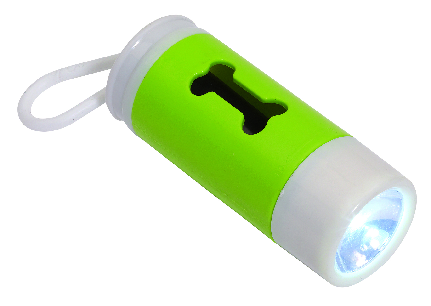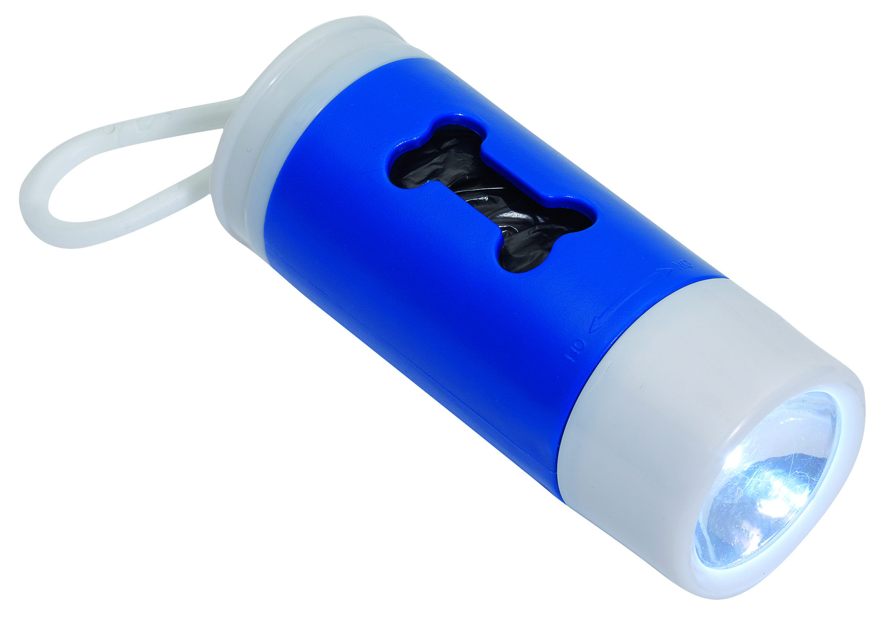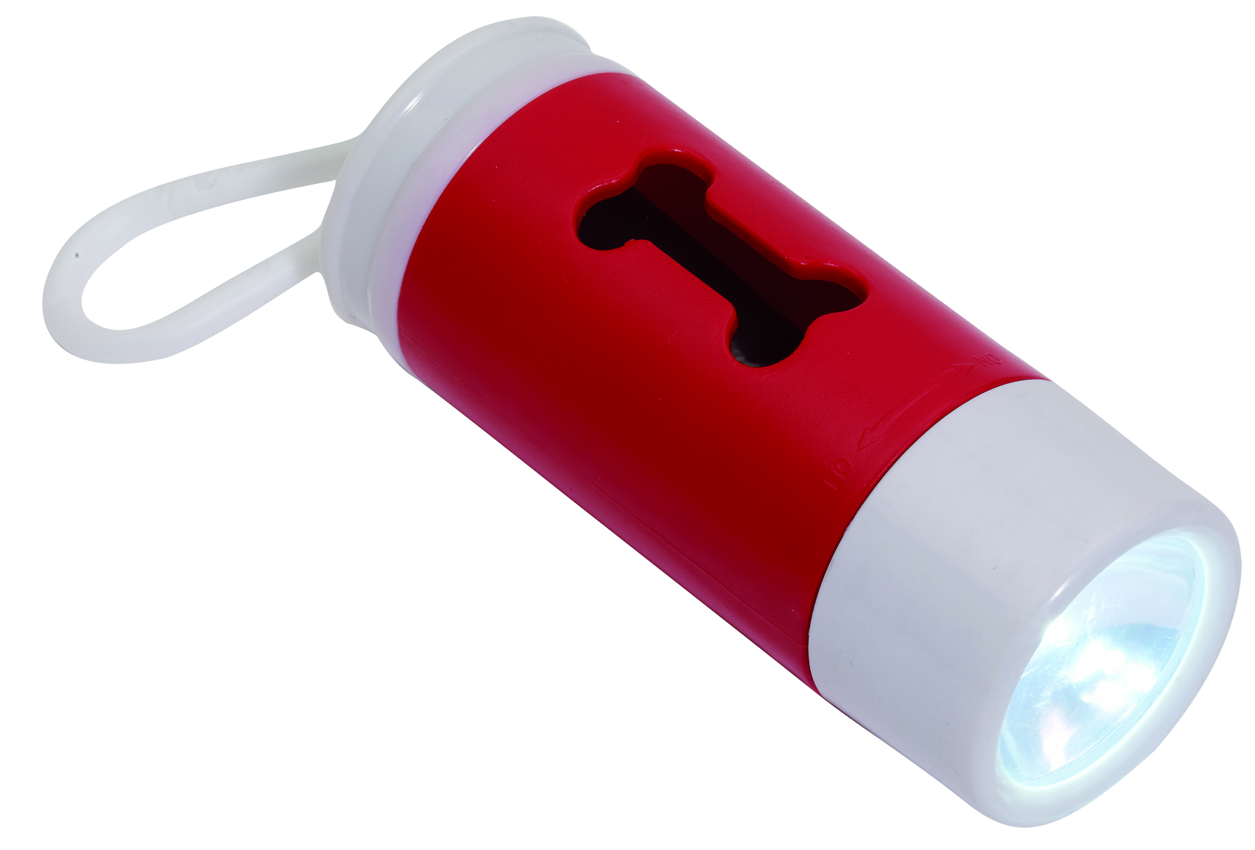 Taschenlampe DOGS HELPER mit Müllbeuteln: weißes LED-Licht, Drehmechanismus zum An- und Ausschalten, Kunststoff-Gehäuse mit Aussparung in Knochenform, Drehverschluss mit Karabinerhaken am Lampenende zum Auswechseln der Mülltüten 3 Knopfzellen inliegend
