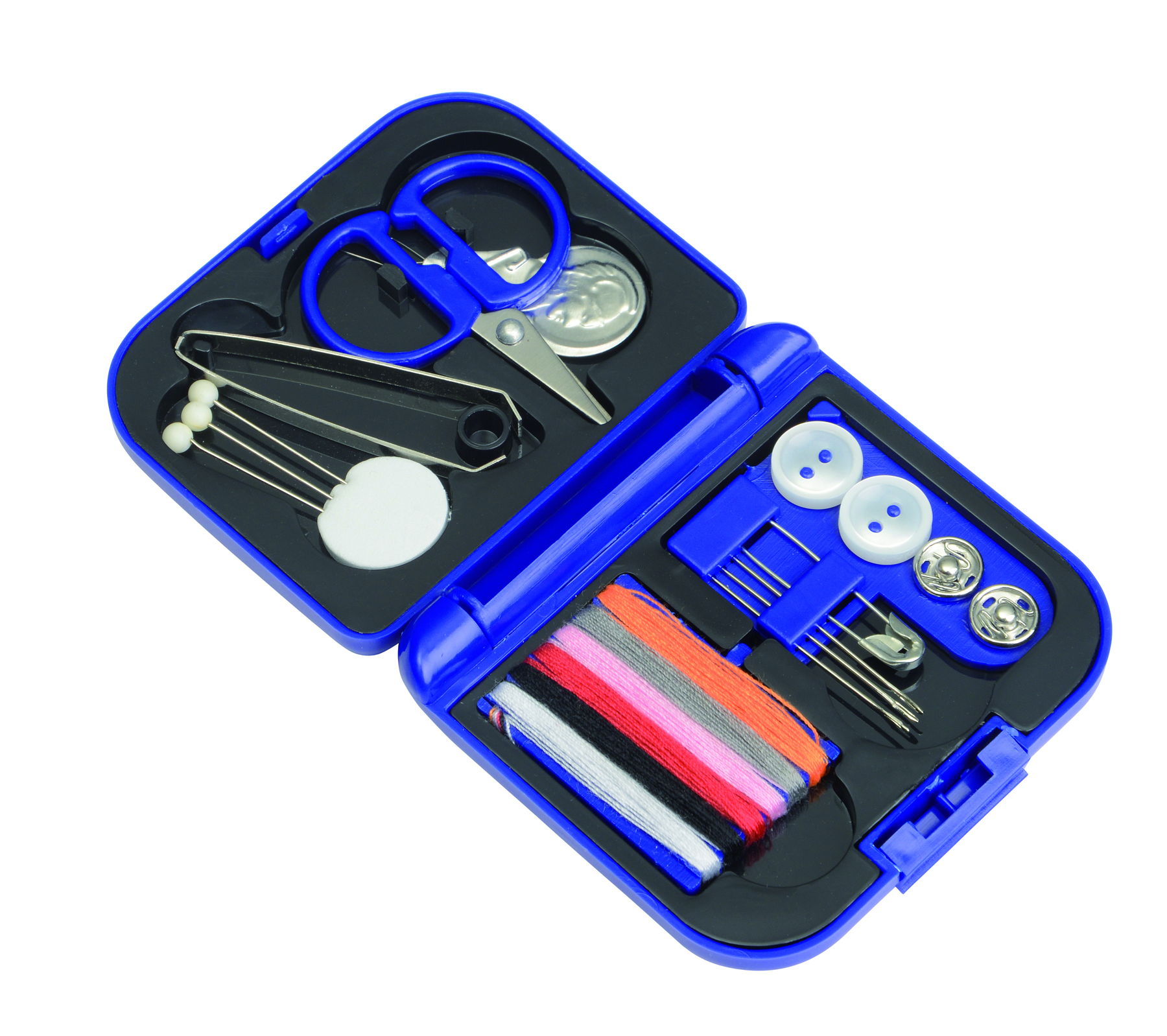 Nähset mit großer Werbefläche sowie Schere, Näh- und Sicherheitsnadeln, Reserveknöpfe, Garn, Einfädler, 2 Knöpfe. VPE 500.