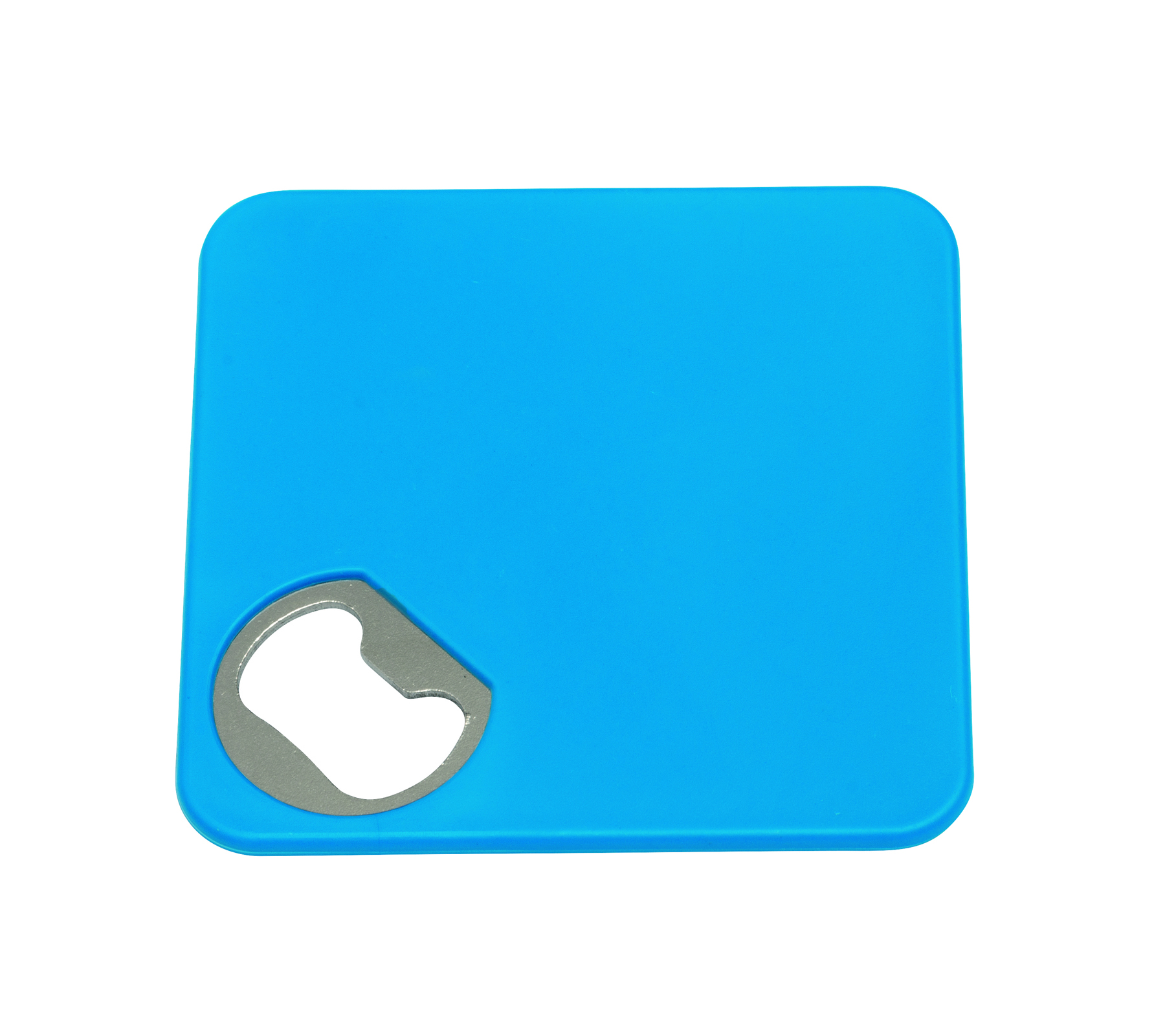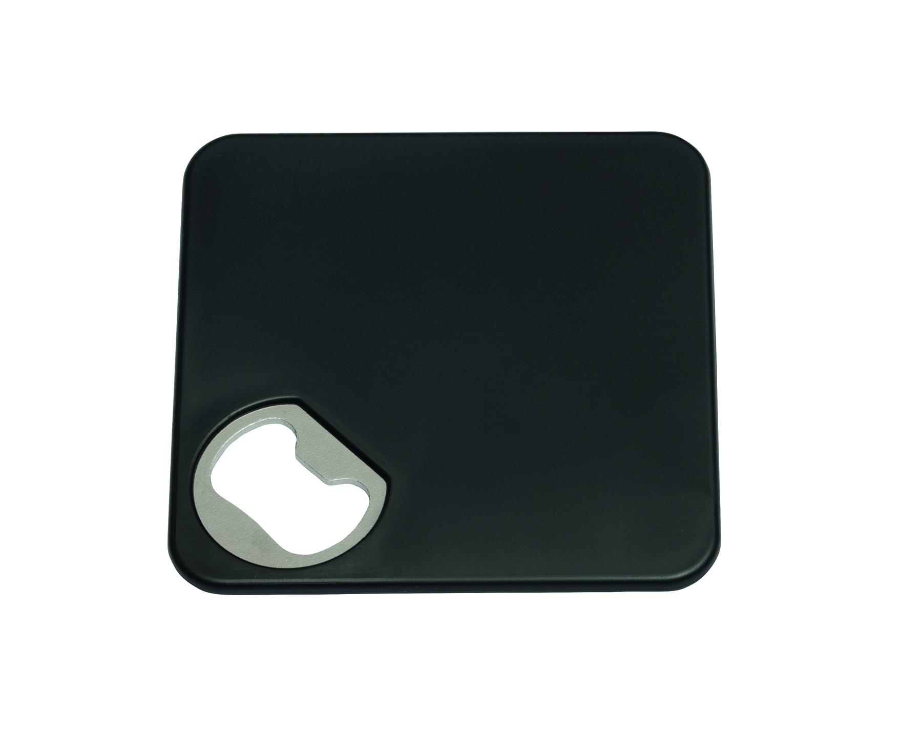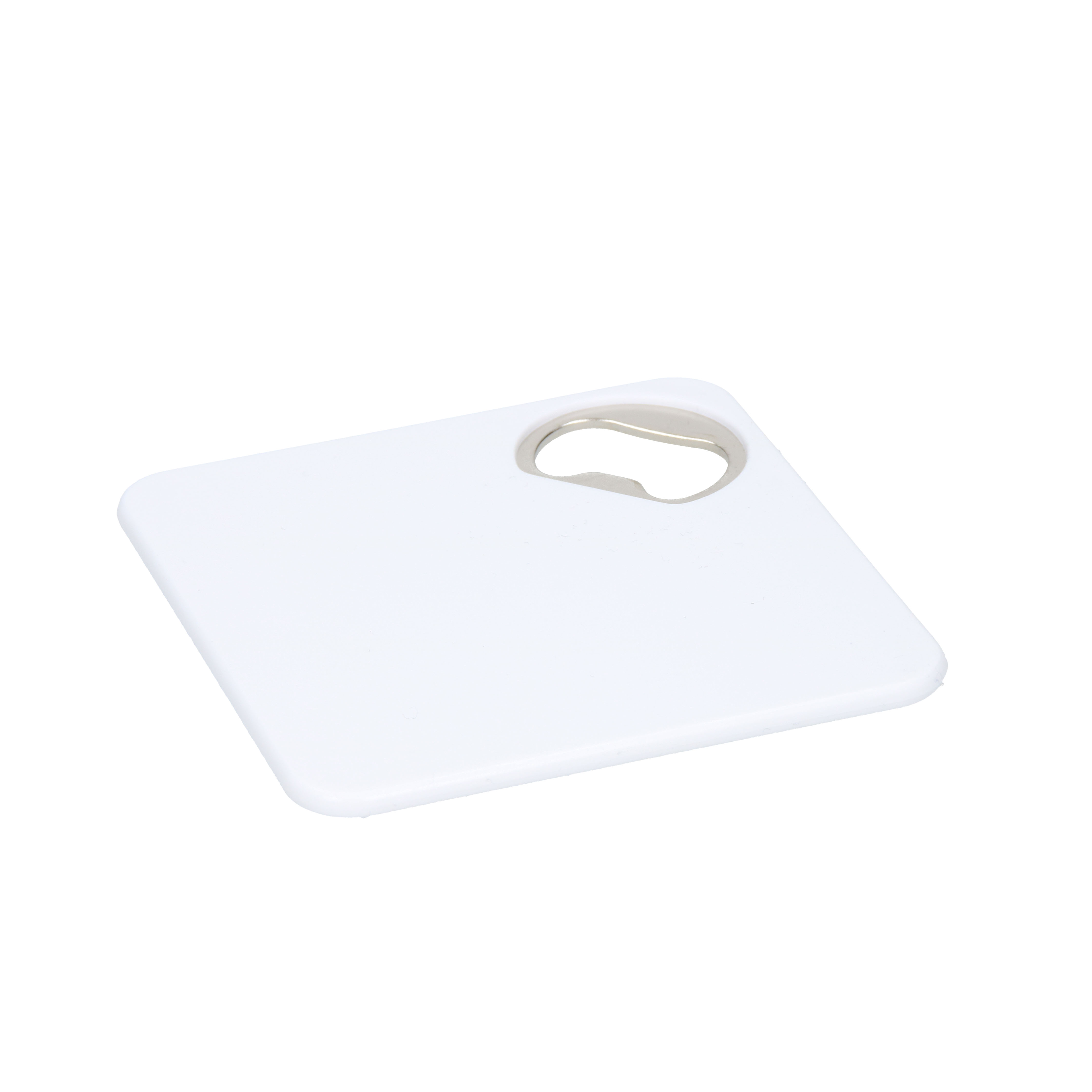 Aus eins mach zwei - Der Untersetzer mit Flaschenöffner hat eine rutschfeste Unterseite und bietet zudem jede Menge Platz für Ihre Werbung!Kunststoff, Metall, weiß, Flaschenöffner, Polybeutel.