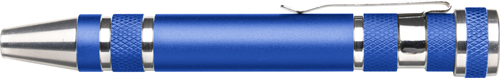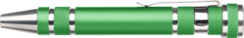 Multifunktionaler Werkzeugstift mit einfach raus drehbarem Kugelschreiber. Im Stift sind 5 Bits, die auf den Stift gesteckt werden können. Mit LED-Leuchte. Batterien inklusive.