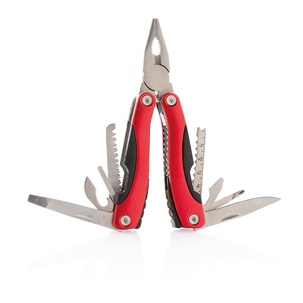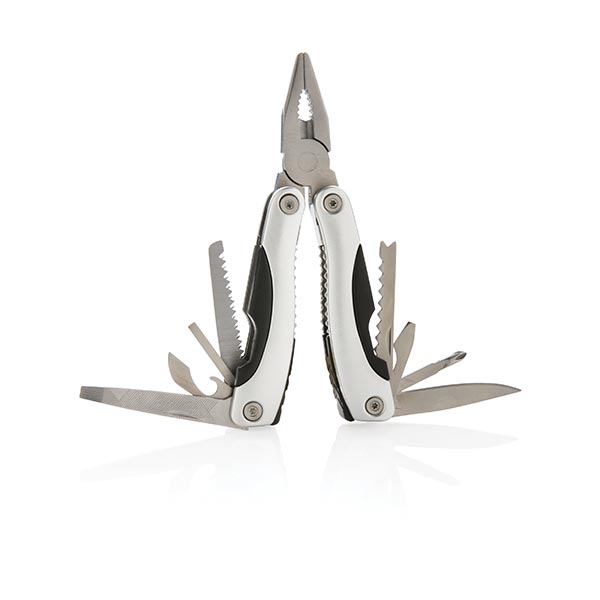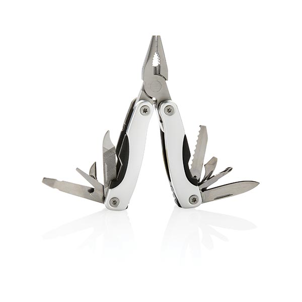 Multitool aus Edelstahl in Kreditkartenformat mit 11 Funktionen: Dosenöffner, Schraubenzieher, Lineal, Kapselheber, Schraubenschlüssel, Flügelzange, Säge, Winkelmesser, 2-seitiger Schraubenschlüssel und Schlüsselanhänger. In einem Etui aus Imitatleder. Inklusive Gebrauchsanweisung.