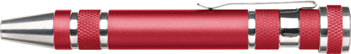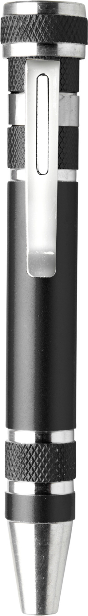 Werkzeug-Set: Aluminium Taschenlampe mit 9 LEDs sowie ein Multifunktionswerkzeug in Form eines Stiftes. Inklusive 3 Schlitz- und 3 Kreuzschraubenziehern. 3 AAA Batterien exklusive. Lieferung in einer Schachtel.