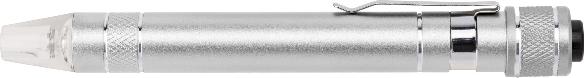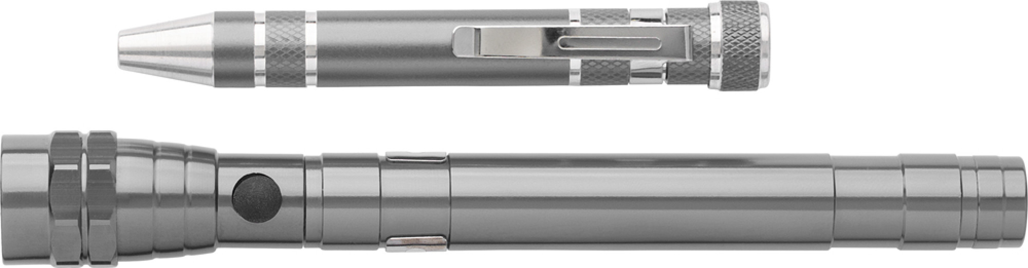Werkzeug-Set: Aluminium Taschenlampe mit 9 LEDs sowie ein Multifunktionswerkzeug in Form eines Stiftes. Inklusive 3 Schlitz- und 3 Kreuzschraubenziehern. 3 AAA Batterien exklusive. Lieferung in einer Schachtel.