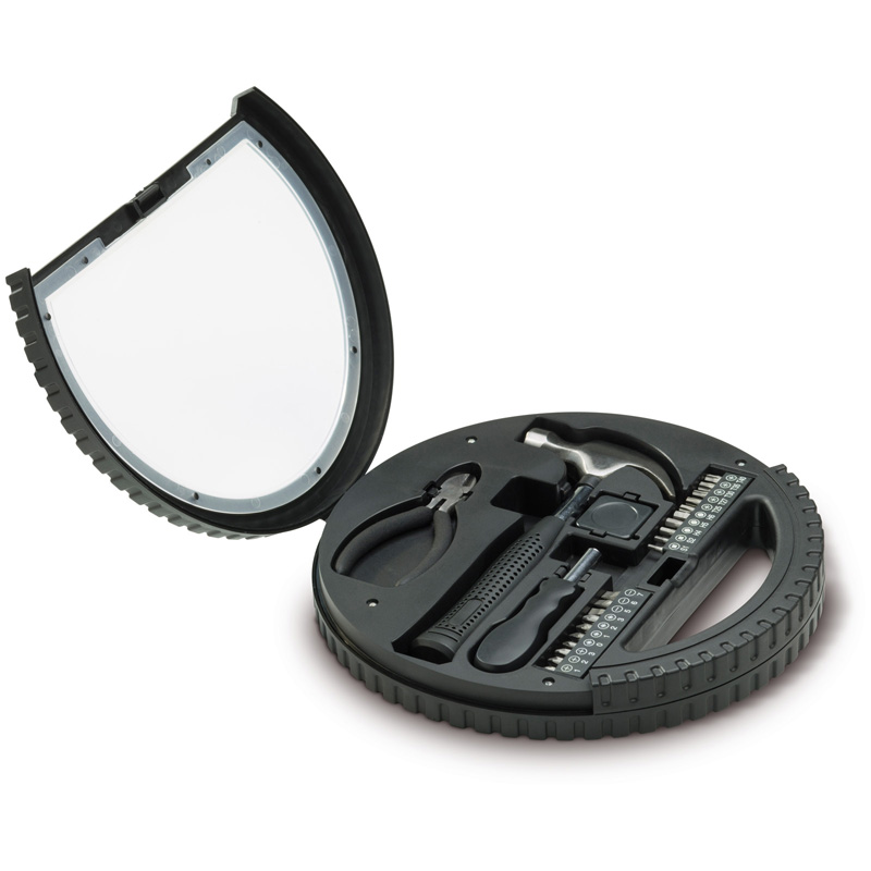 25-teiliges Werkzeugset in der Form eines Reifen und mit handlichem Griff. Die Außenseite des Gehäuses hat ein Reifenprofil, damit das Set noch mehr einem Reifen ähnelt.