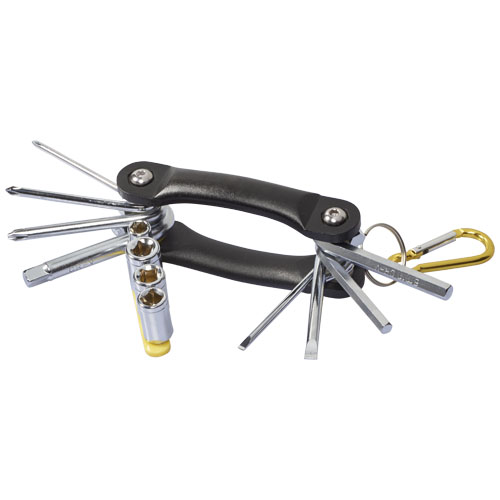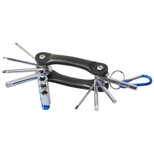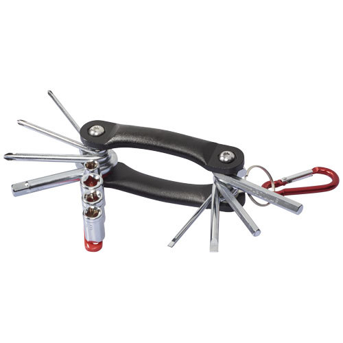 Tycoon 12 Funktionen Multifunktionswerkzeug. Multifunktionswerkzeug mit 12 Funktionen. 3 Kreuz- und 2 Flachschraubendreher, 2 Sechskantschlüssel aus Karbon-Stahl mit Chrom-Überzug. Inkl. farbigem Adapter mit 4 Fassungen und farblich passendem Karabiner (nicht zum Klettern geeignet). Aluminium.