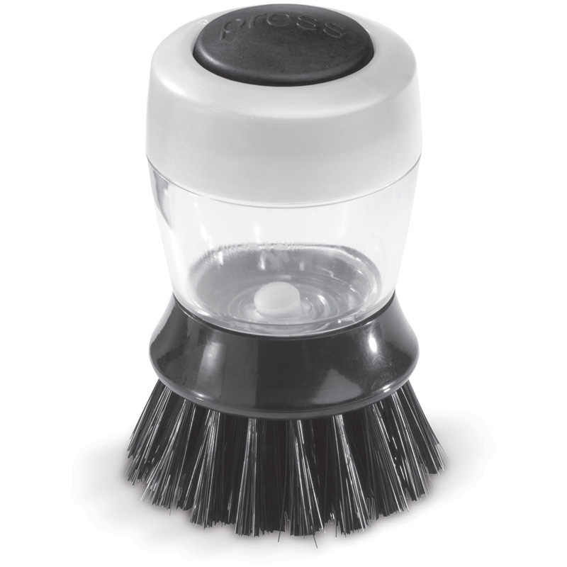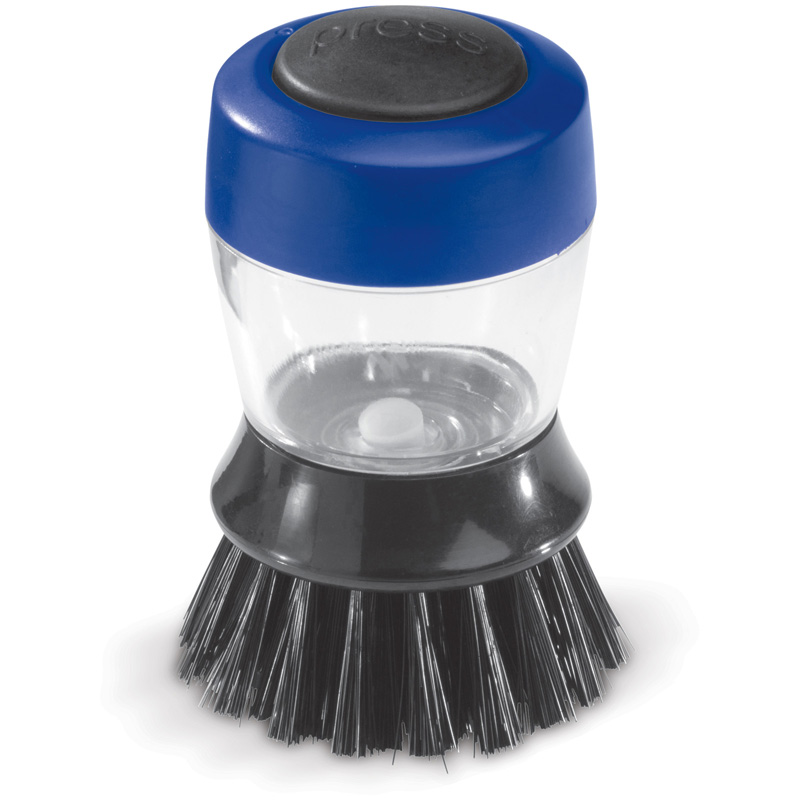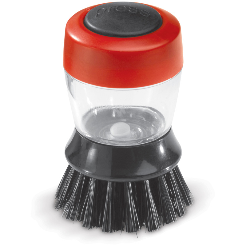 Kompakte Spülbürste mit Druckfläche auf dem Handgriff. Es ist möglich, dass transparente Fach mit Spülmittel zu füllen. Ideal beim Campen, in der Küche oder unterwegs.
