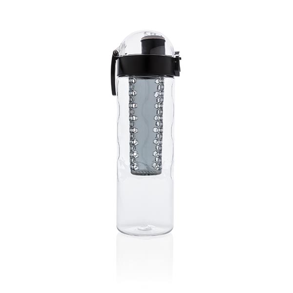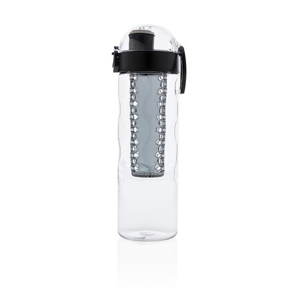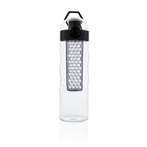 Geben Sie gesunde Früchte hinzu um Ihr Wasser zu aromatisieren. Mit ihrem Wabendesign liegt perfekt in Ihrer Hand. Drücken Sie den Knopf und der Deckel springt auf, es gibt aber auch einen speziellen Schließmechanismus, der davor bewahrt die Flasche aus Versehen zu öffnen. Mit Trageriemen. Hergestellt aus langlebigem und innovativem Tritan. 100% BPA-frei. Inhalt: 700ml. Registered design®