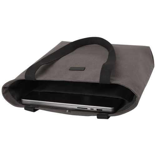 Tasche aus GRS-zertifiziertem, recyceltem Canvas und GRS-zertifiziertem RPET-Futter. Diese vielseitige Tasche verfügt über ein gepolstertes 15“-Laptopfach und zwei Innenfächer für Handy, Geldbörse oder Zubehör. Die Tasche wird mit einem einfachen Knopfverschluss geschlossen und verfügt über bequeme Tragegriffe aus Baumwollgewebe. DDie dekorative matte Metallplatte wird Ihr Logo gekonnt in Szene setzen.
