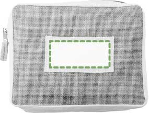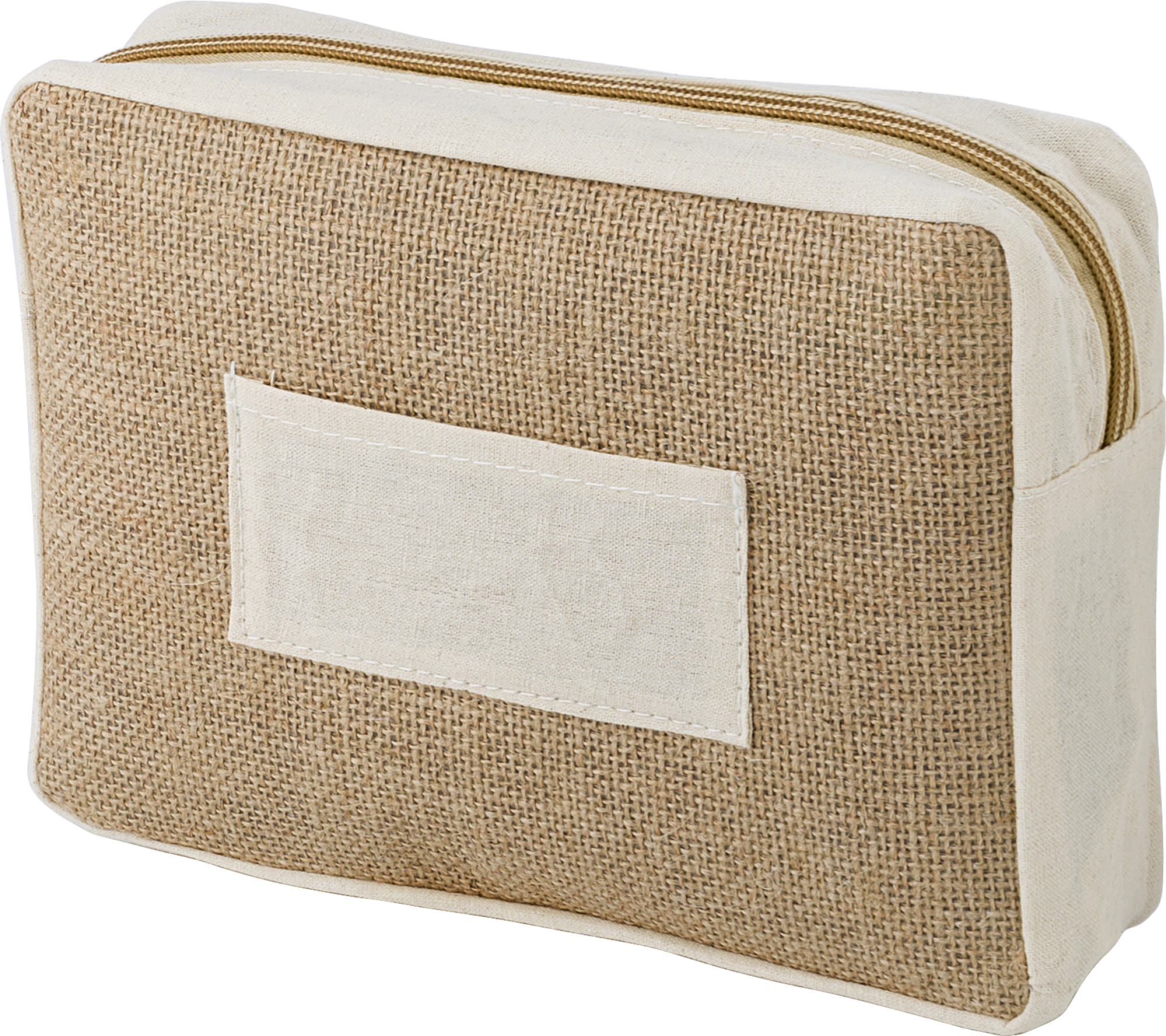 Kulturbeutel aus Jute mit Reißverschluss und Fronttasche.