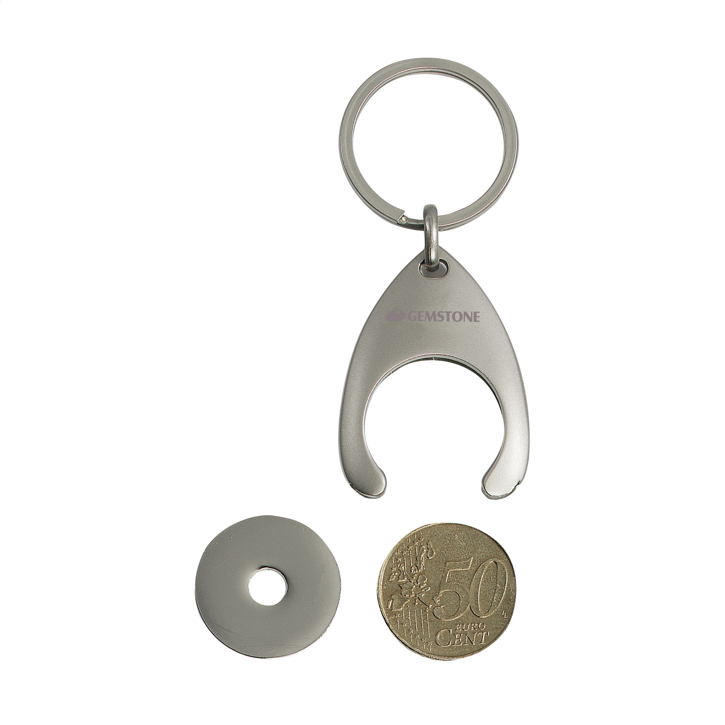 Schlüsselanhänger mit Münzhalter aus Stahl inkl. Einkaufswagenmünze. Pro Stück in einer Verpackung.
