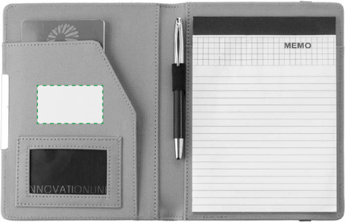 Dokumentenmappe aus PVC, ca. DIN A4-Format, mit 6 Einsteckfächern, Stifthalter (ohne Stift), Metallplättchen für Gravuren und Schreibblock (30 linierte Blätter).