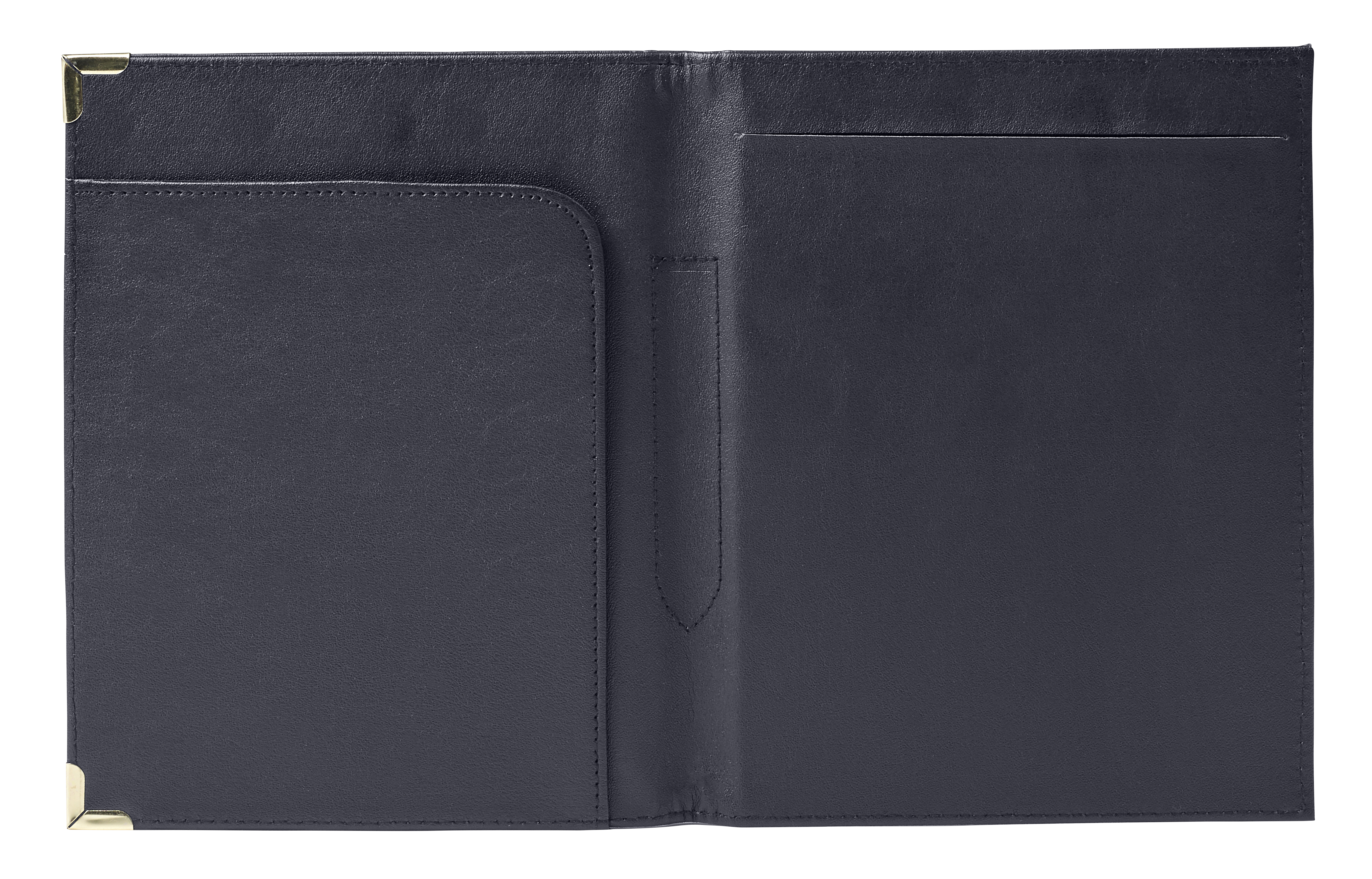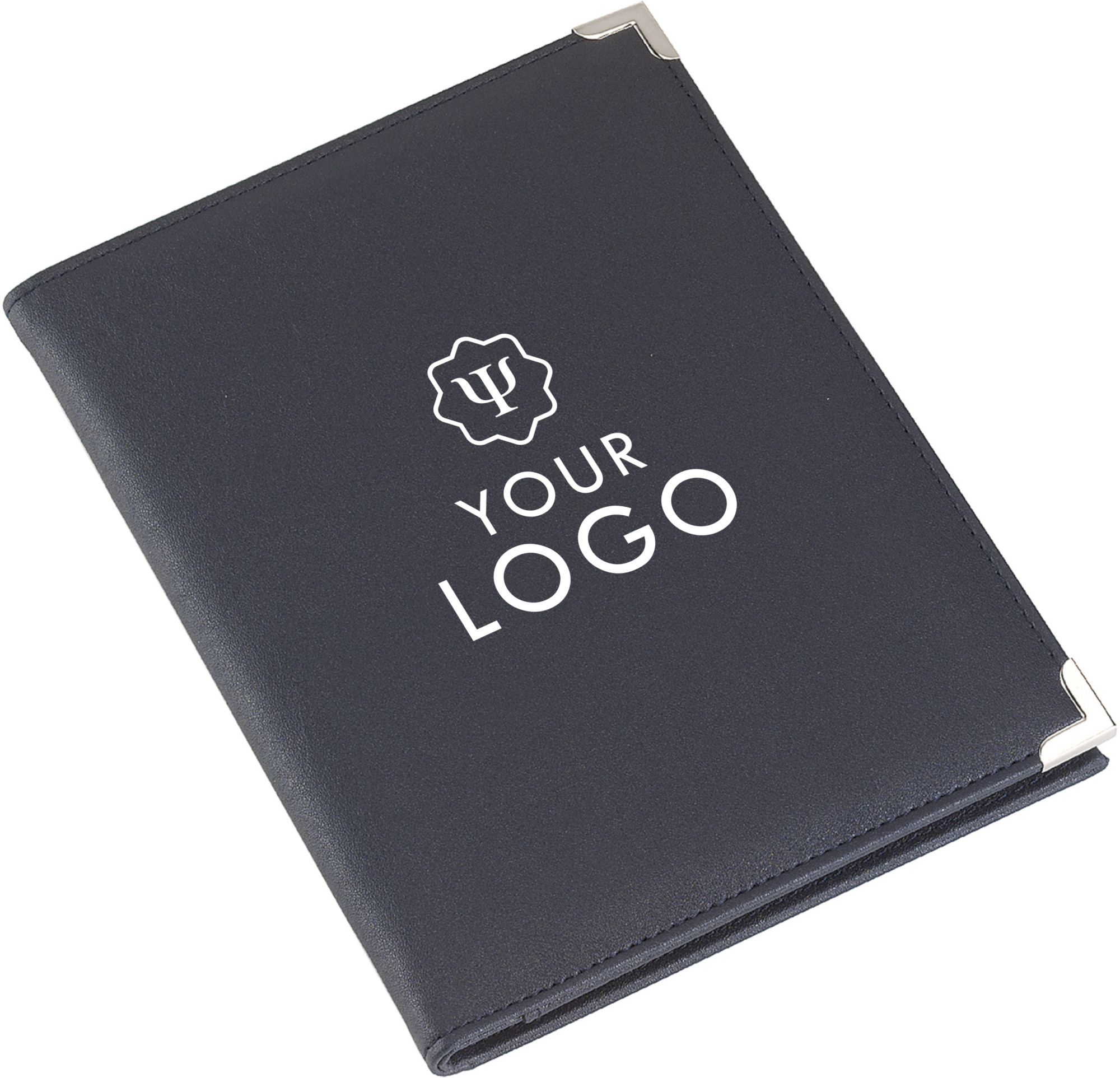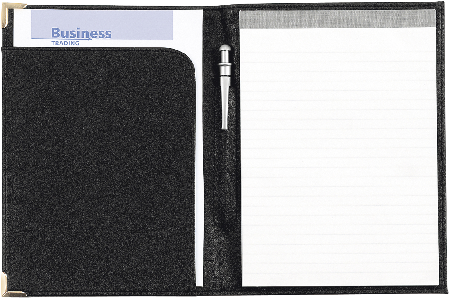 Konferenzmappe aus PU mit Metallecken, ca. DIN A5-Format, Einsteckfach und Stifthalter (ohne Stift). Lieferung erfolgt ohne Schreibblock.