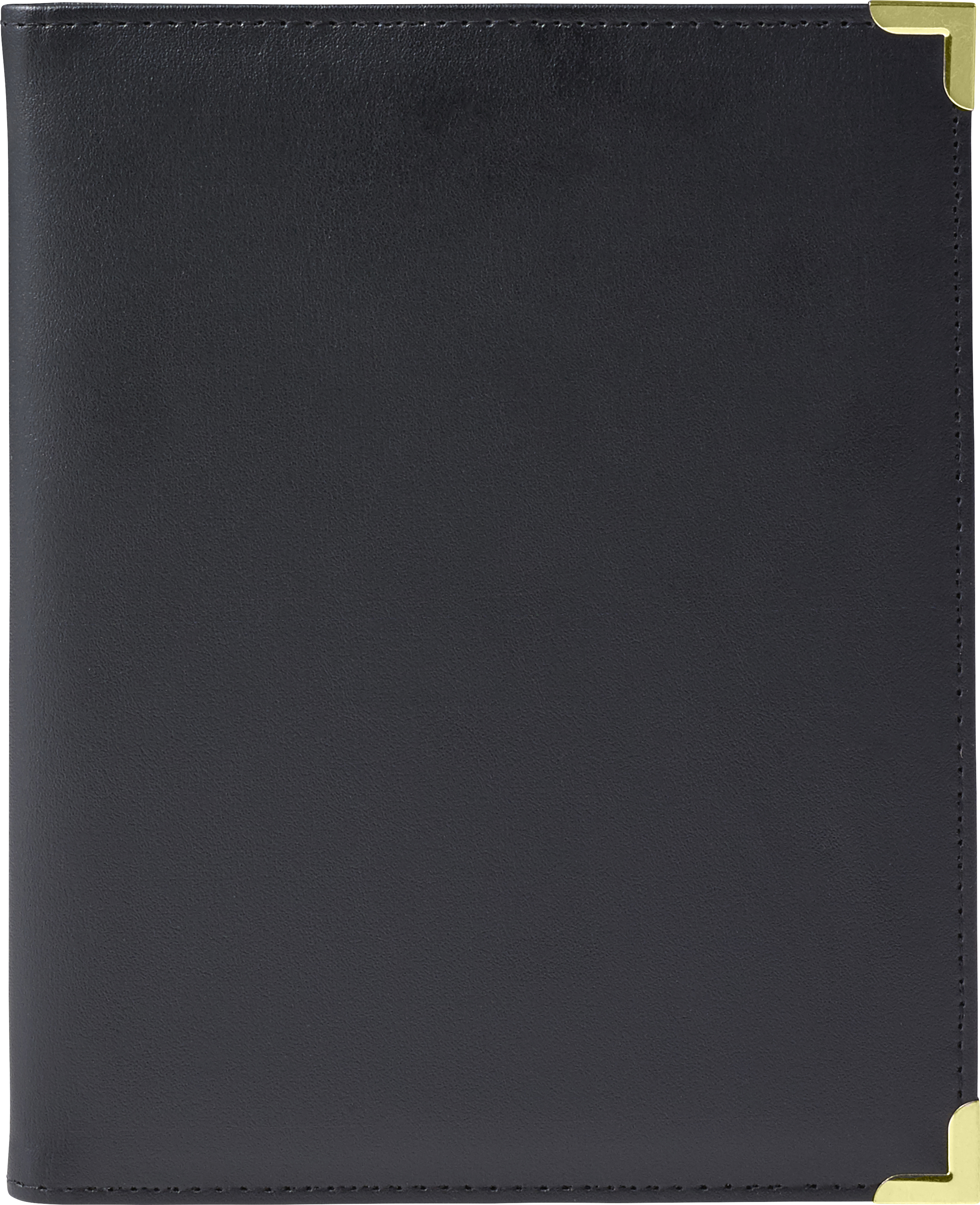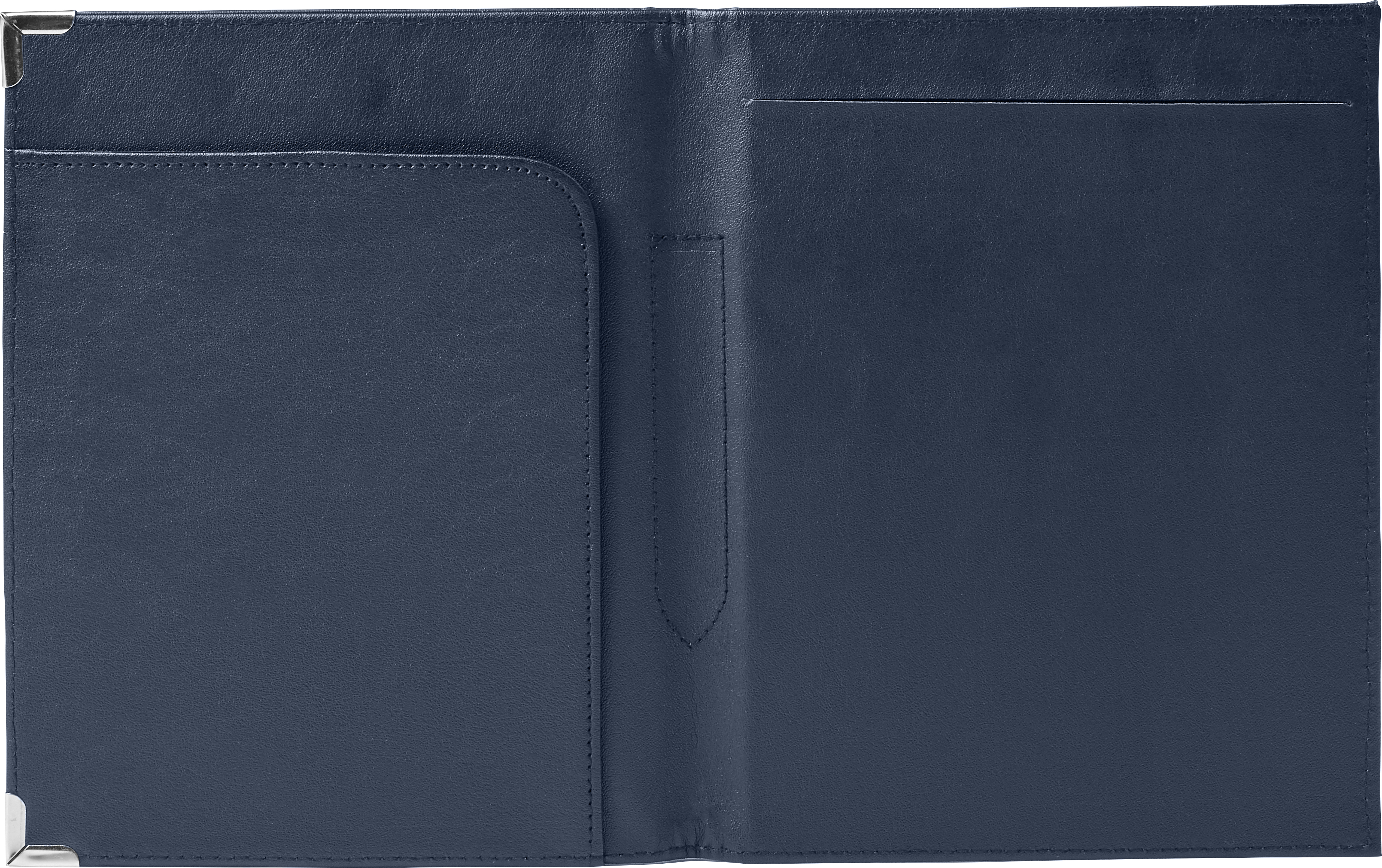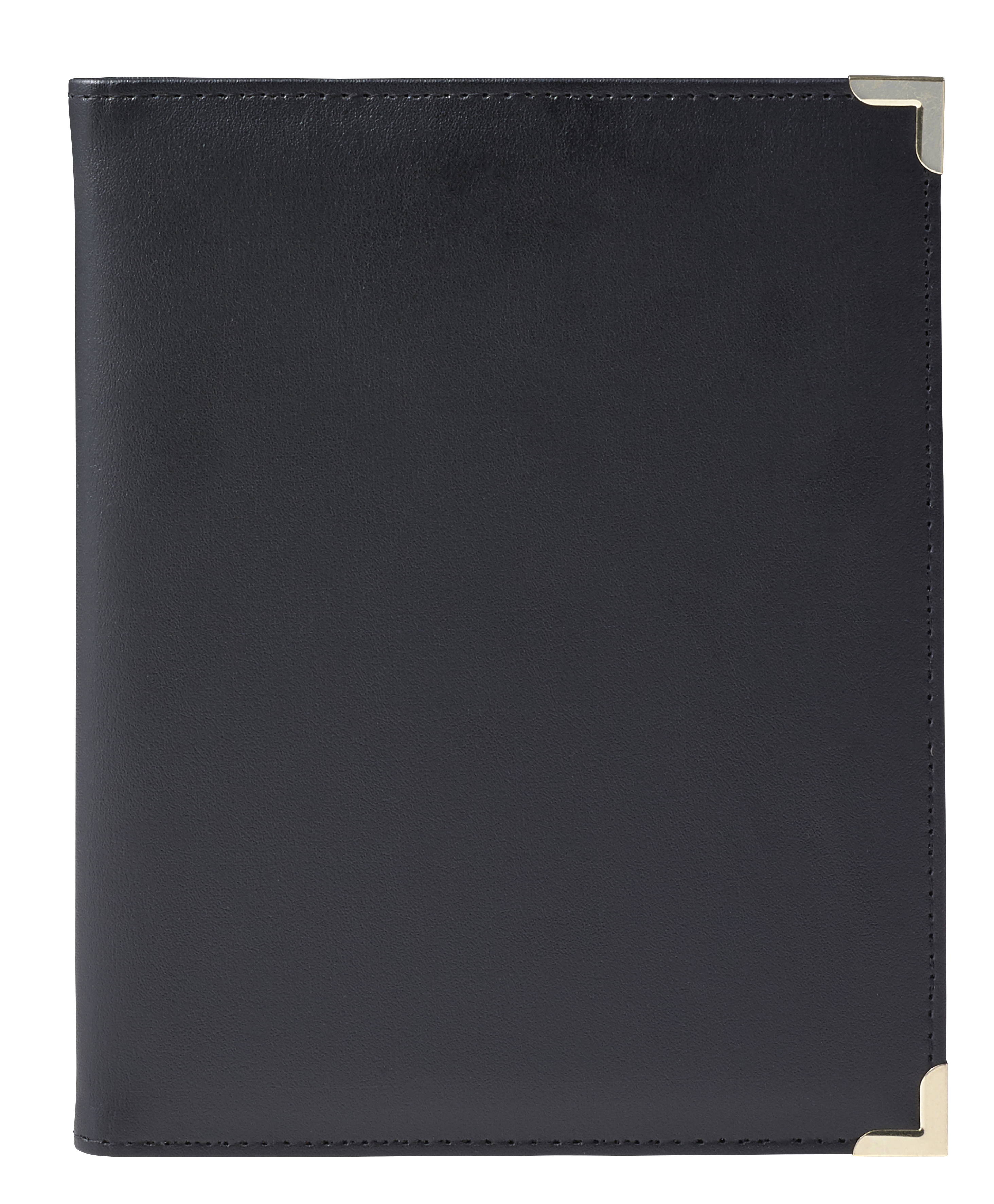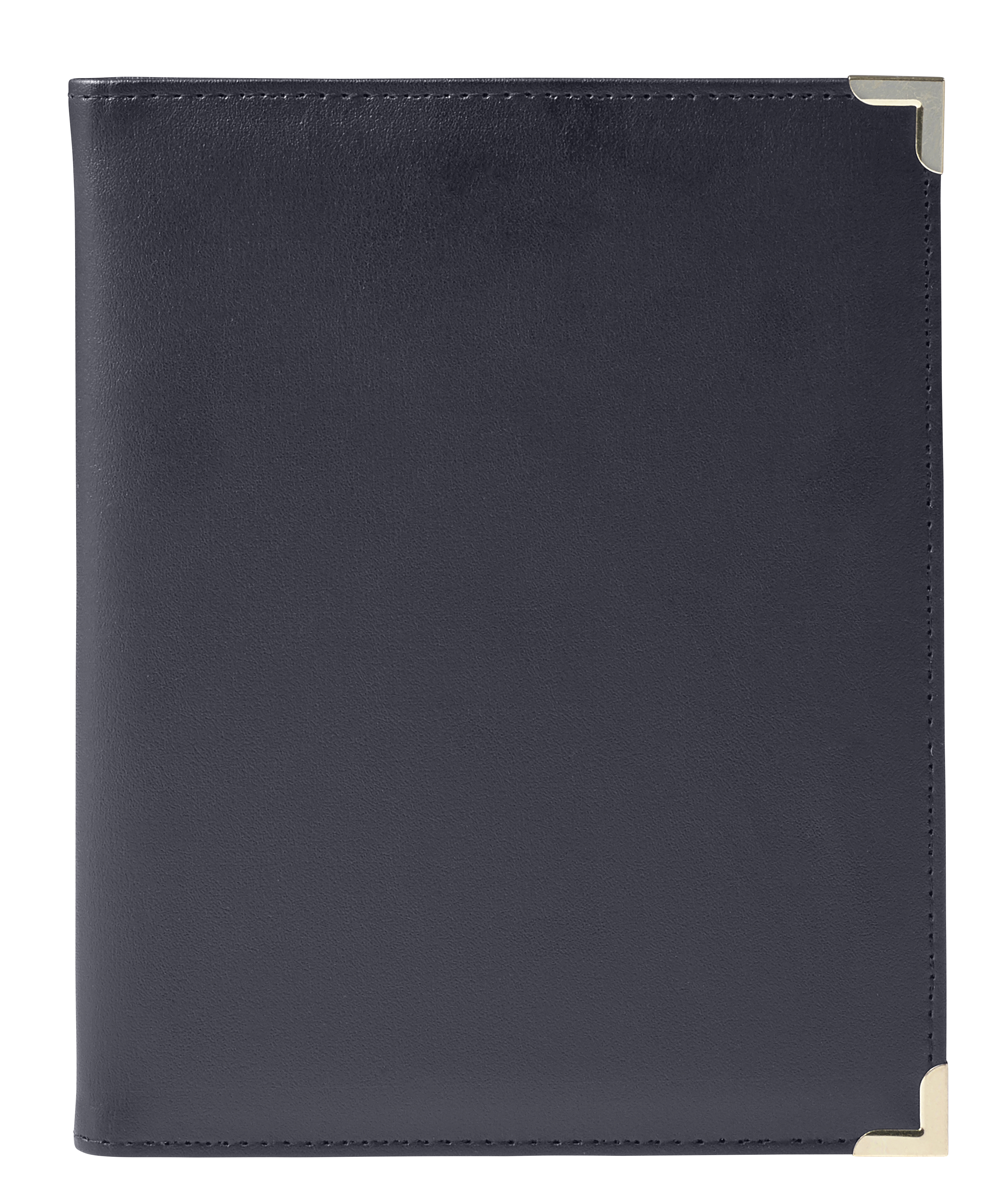 Konferenzmappe aus PU mit Metallecken, ca. DIN A5-Format, Einsteckfach und Stifthalter (ohne Stift). Lieferung erfolgt ohne Schreibblock.