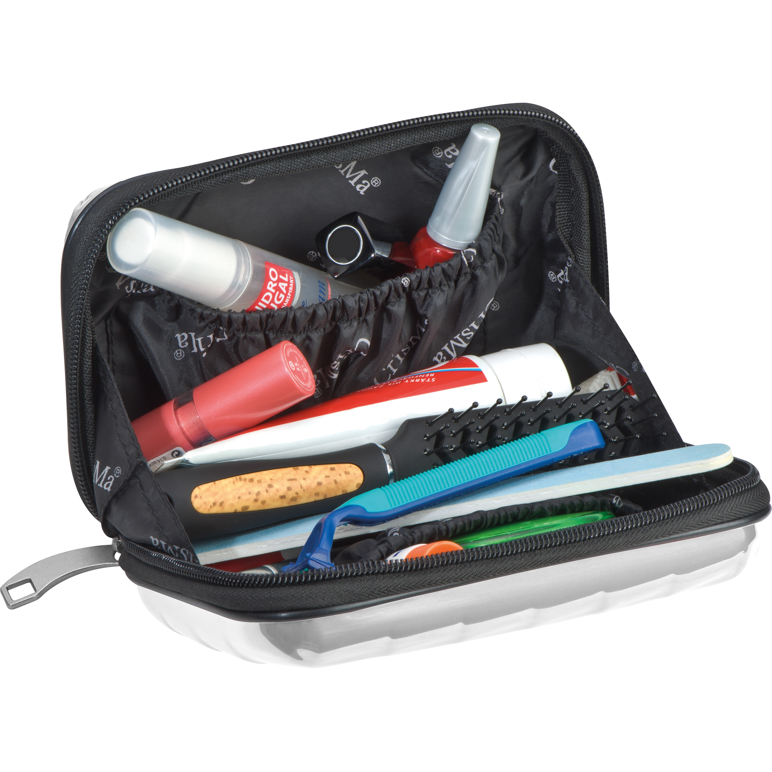 Kleiner Kosmetikkoffer in Hartschalenoptik mit zwei Metallplättchen. Hier finden alle Kosmetikutensilien, die Sie für die Reise brauchen, Platz. Ihre Werbung lasern wir auf dem Metallplättchen.