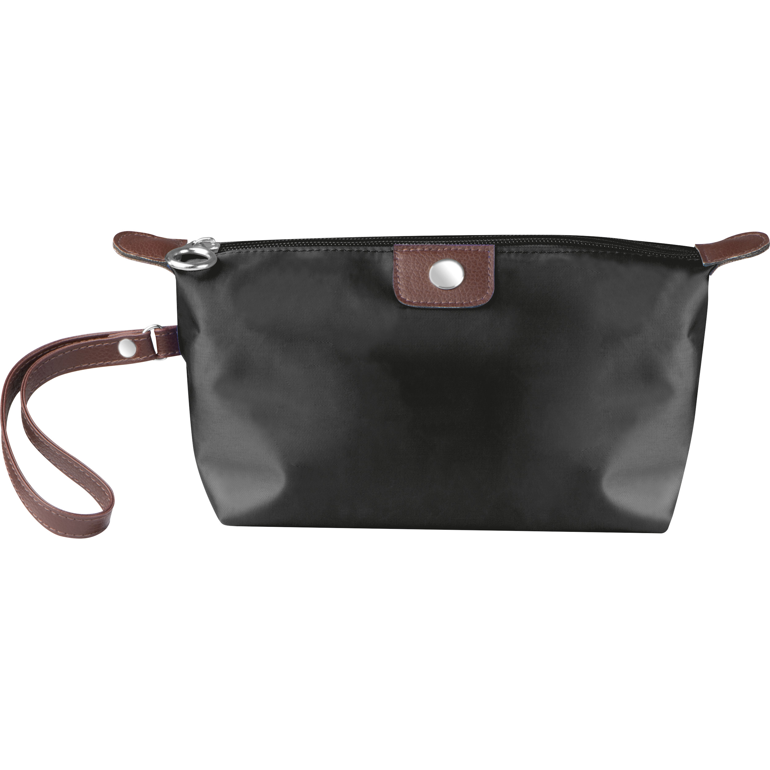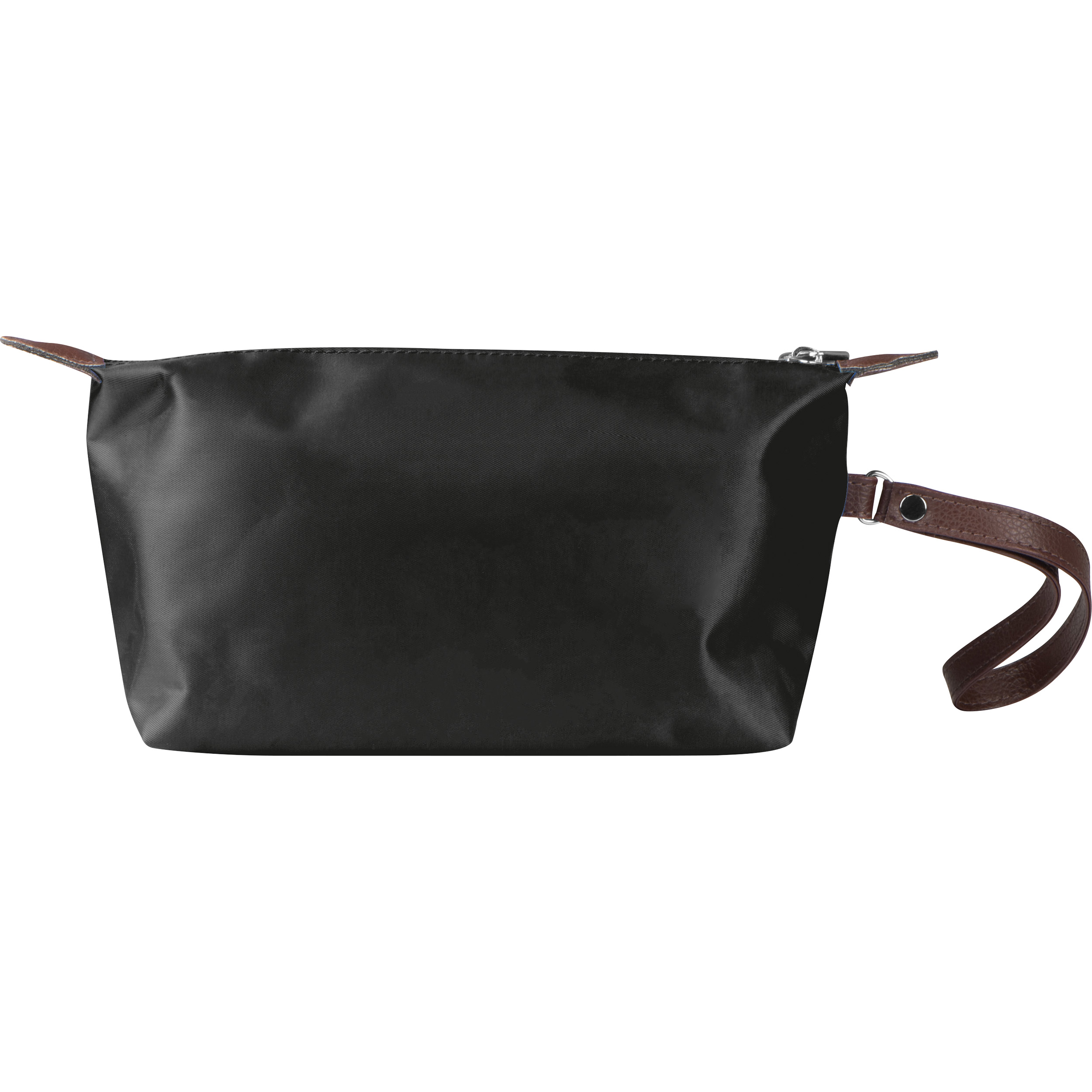 Kosmetiktasche mit Kunstleder Applikation auf der Vorderseite und der Tragelasche und einem Reißverschluss zum Verschließen. Die Werbung wird vorne auf das Täschchen gedruckt.