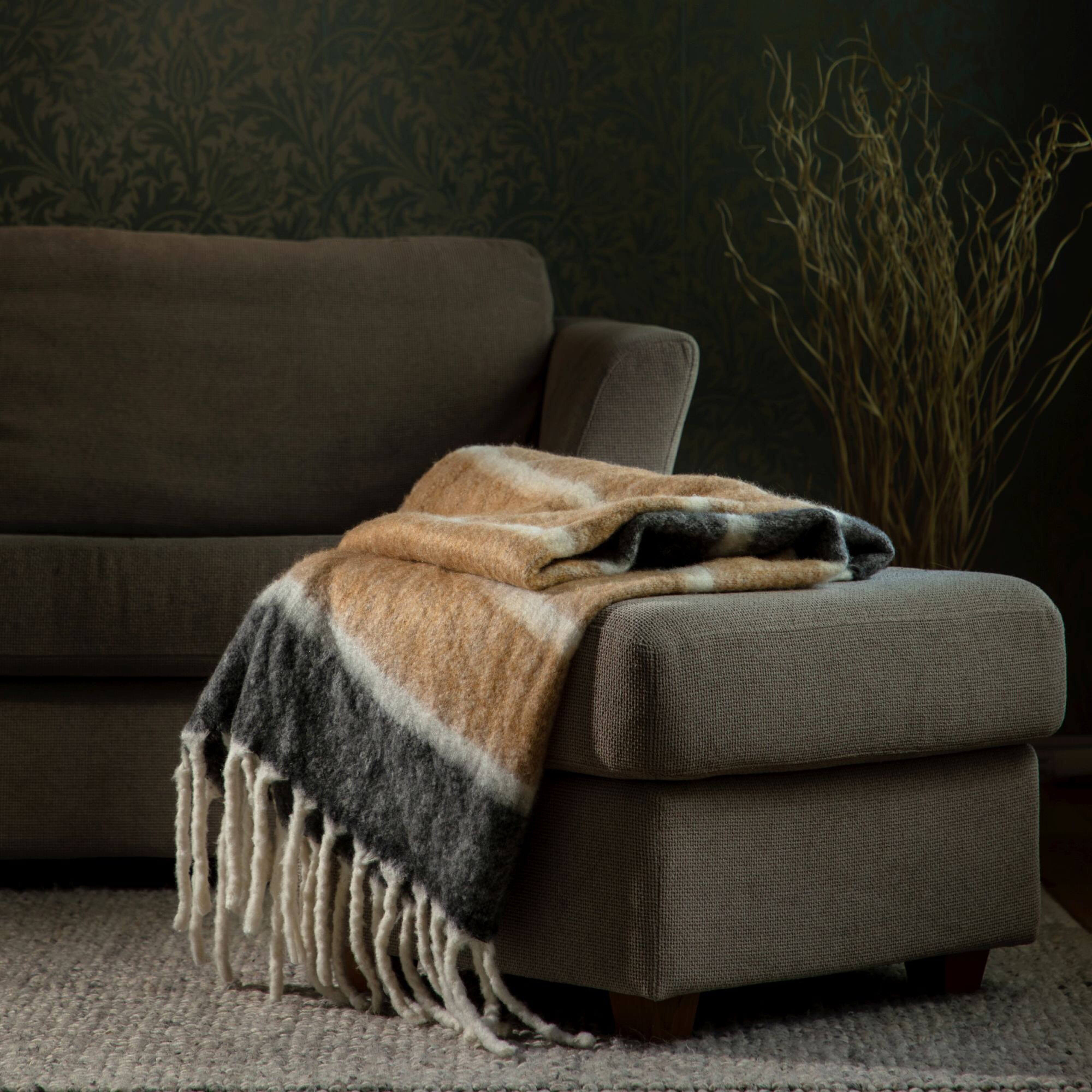 Dieses gestreifte, handgewebte Plaid ist sowohl gemütlich als auch stilvoll! Es ist aus hochwertiger Wolle und Acryl gefertigt und verleiht mit seinen großen, dicken Fransen einen zusätzlichen Hauch von Eleganz. Perfekt für einen kalten Winterabend.