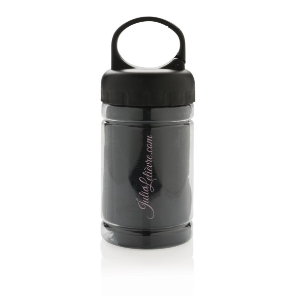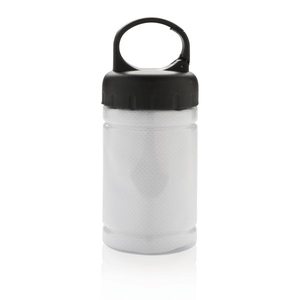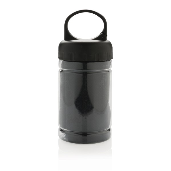 Mikrofaser Kühlhandtuch zu 100% frei von Chemikalien, aber 98% Sun-Blocker-Funktion bis zu UV50+. Einfach etwas kühles Wasser zum Handtuch in die Dose geben und fertig ist die Erfrischung. Die Flasche aus PP, der Deckel aus ABS und das ganze mit einem Karabiner, um sie bei allen Outdoor-Aktivitäten immer dabei zu haben.