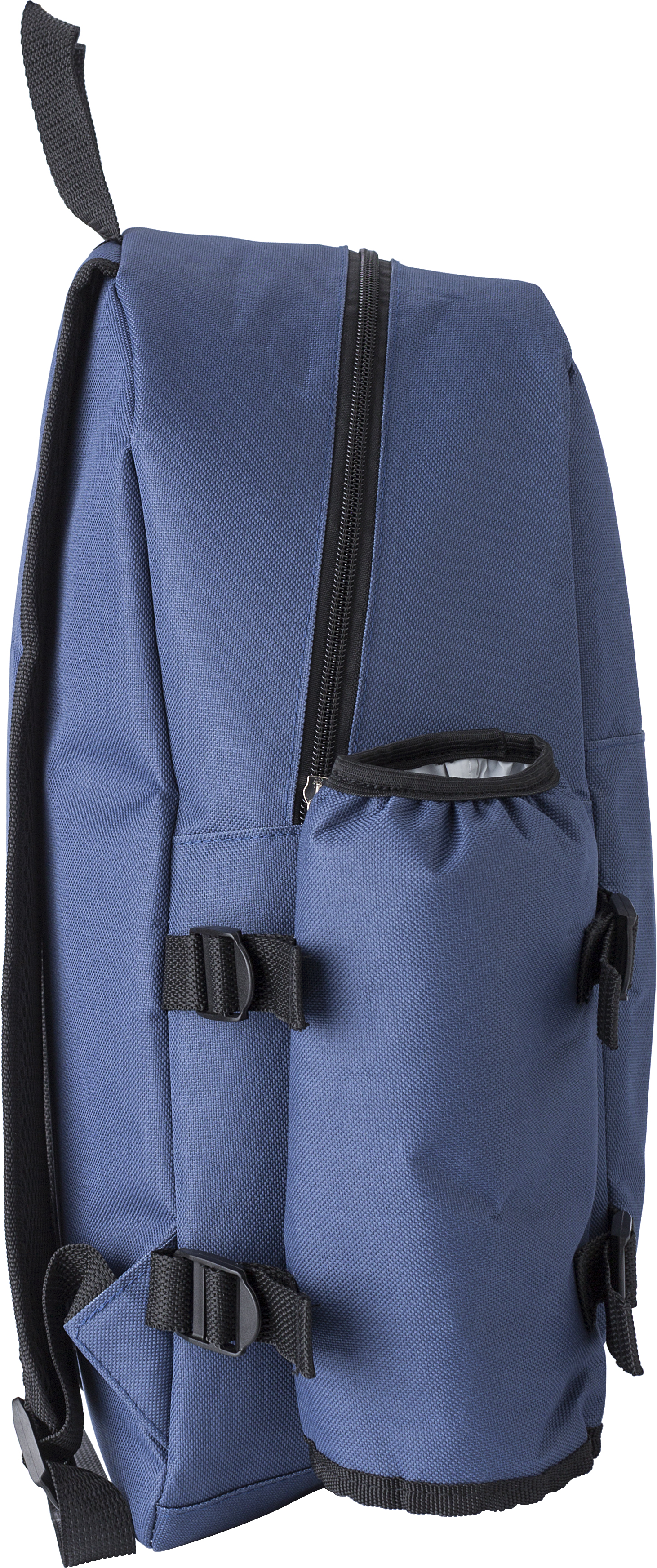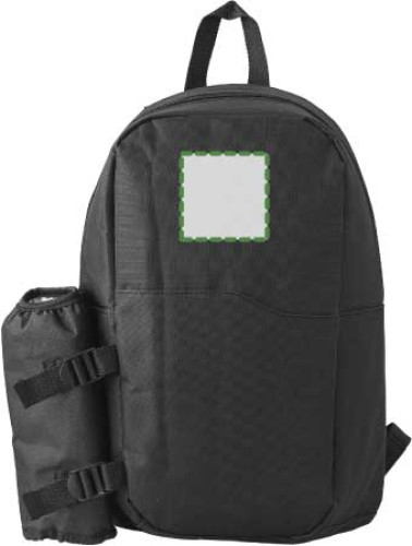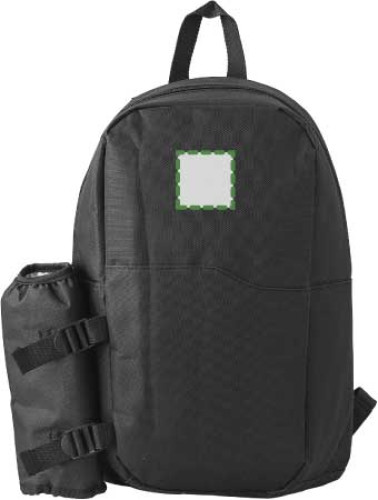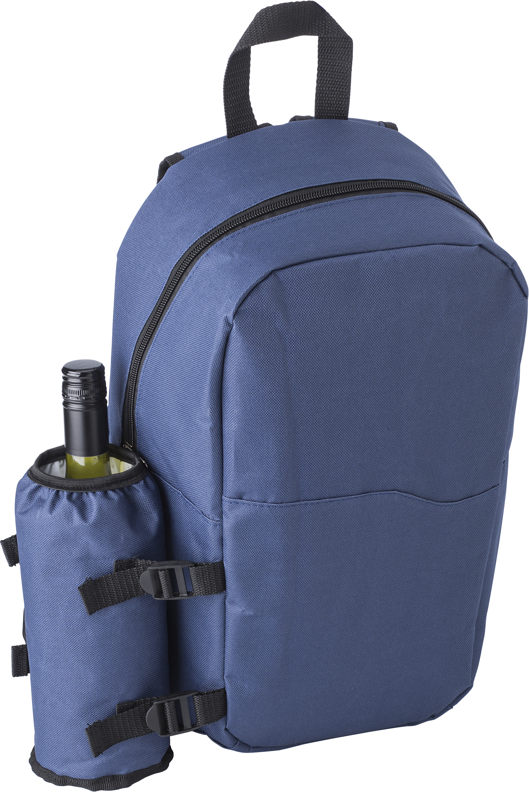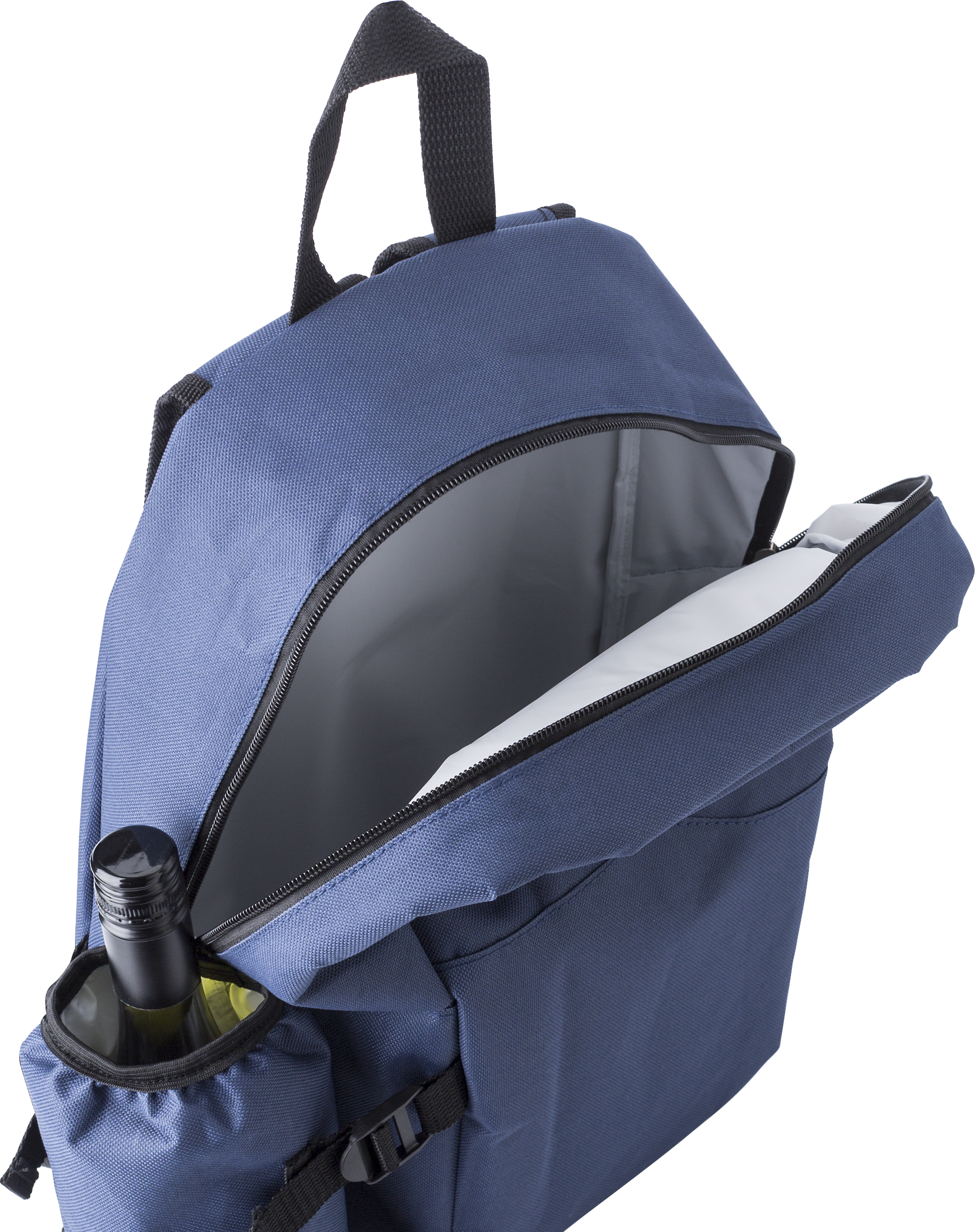 Kühlrucksack aus Polyester (600D) mit einer PEVA-Beschichtung im Inneren. Ein Hauptfach und ein äußeres Fach für eine Flasche. Verstellbare Schultergurte.