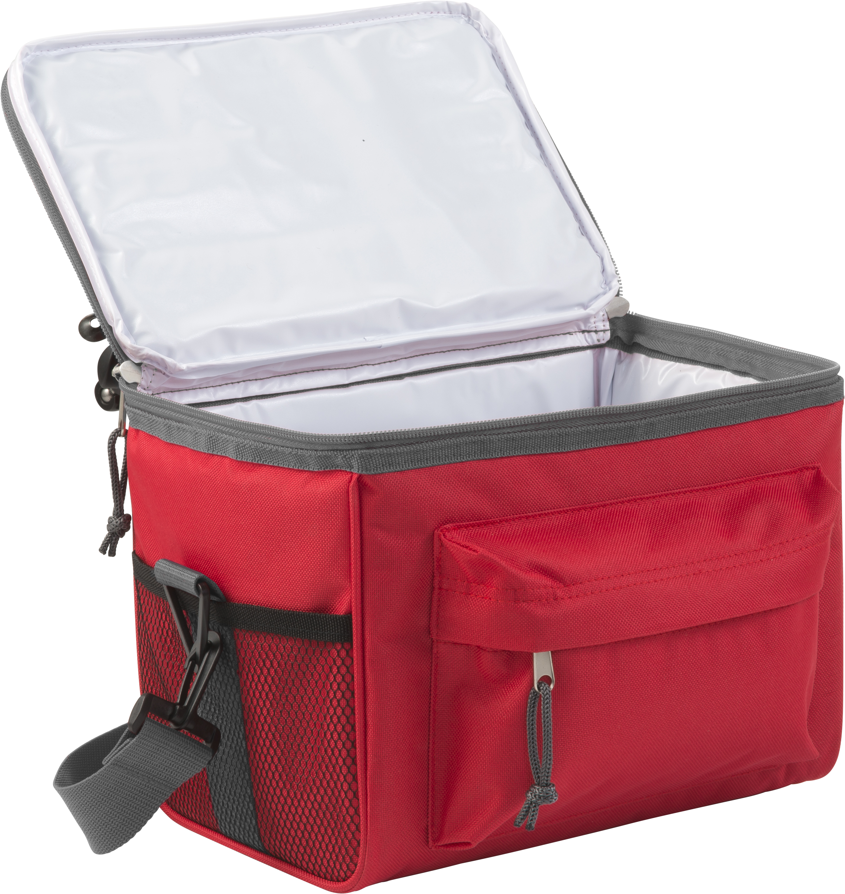 Kühltasche aus Polyester (600D), mit RV-Frontfach und RV-Hauptfach, zwei Netzfächern, Tragegriff und verstellbarem Schultergurt.