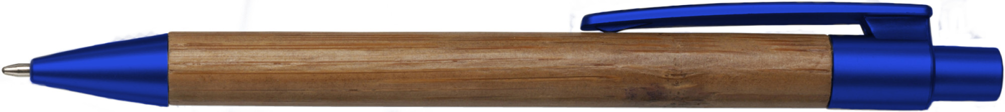 Kugelschreiber aus Bambus, mit Applikationen aus Kunststoff und blauer Mine.