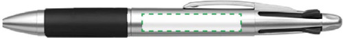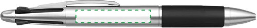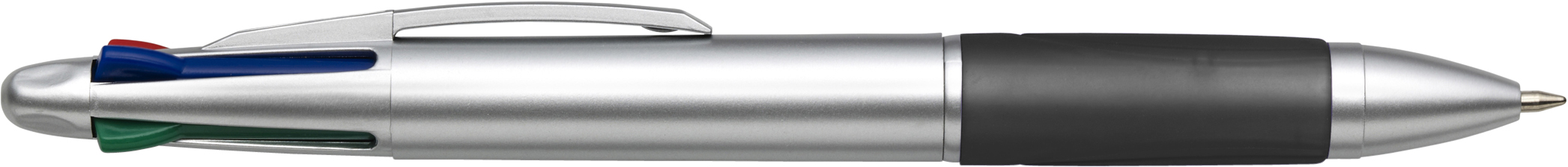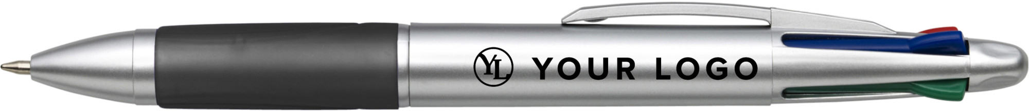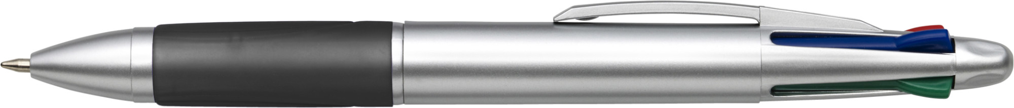 Kugelschreiber aus Kunststoff, mit gummierter Griffzone und 4 verschiedenen Minenfarben (Schwarz, Blau, Grün, Rot).