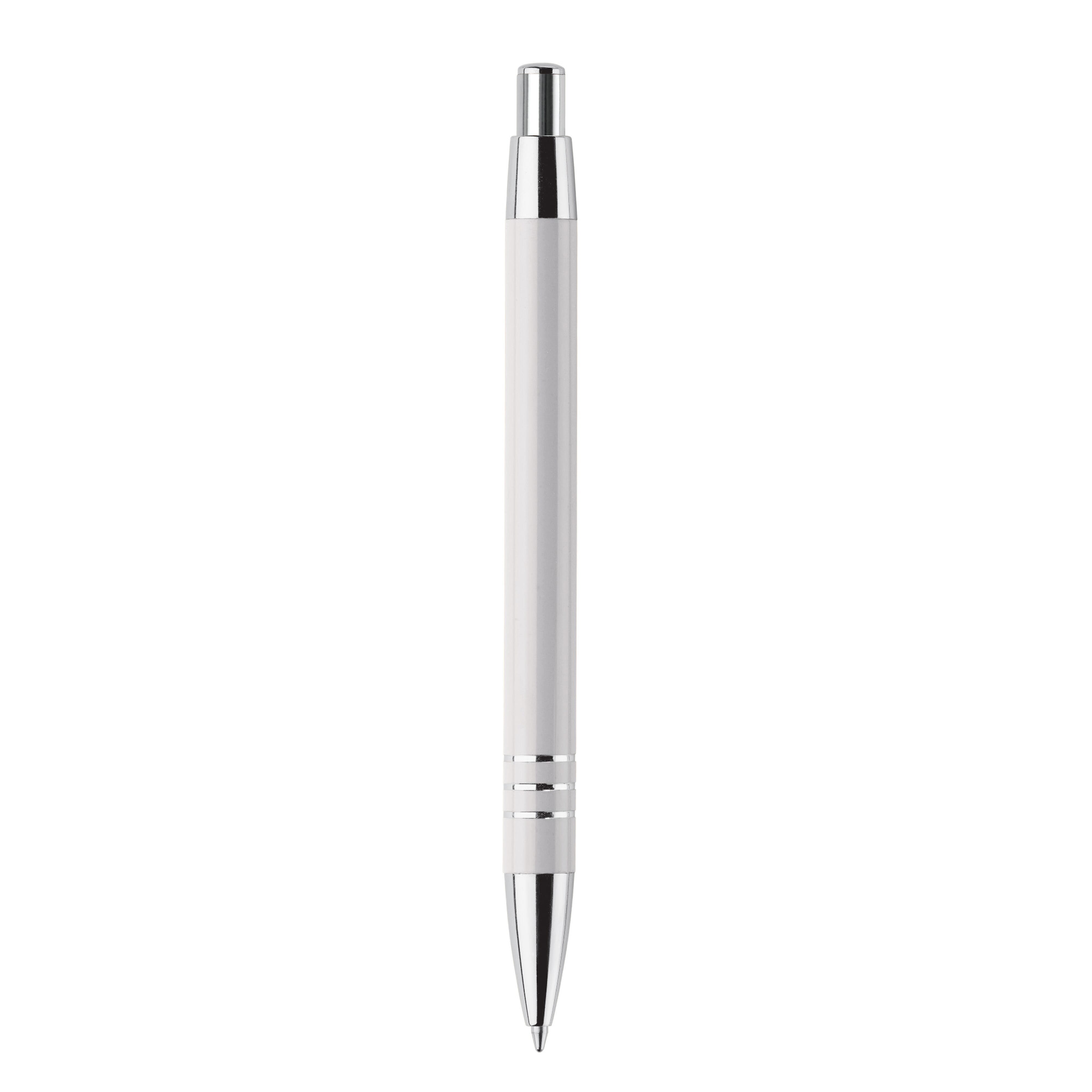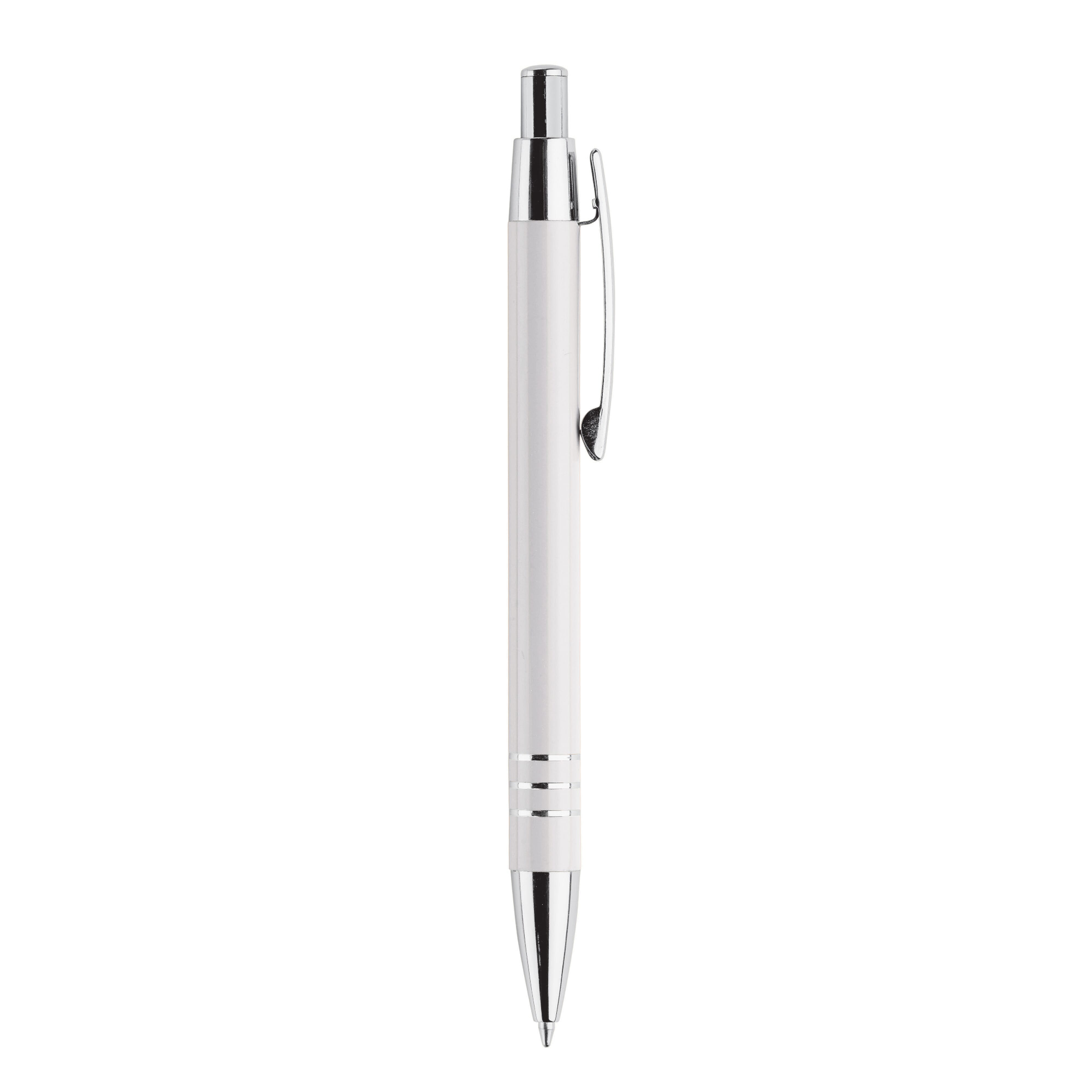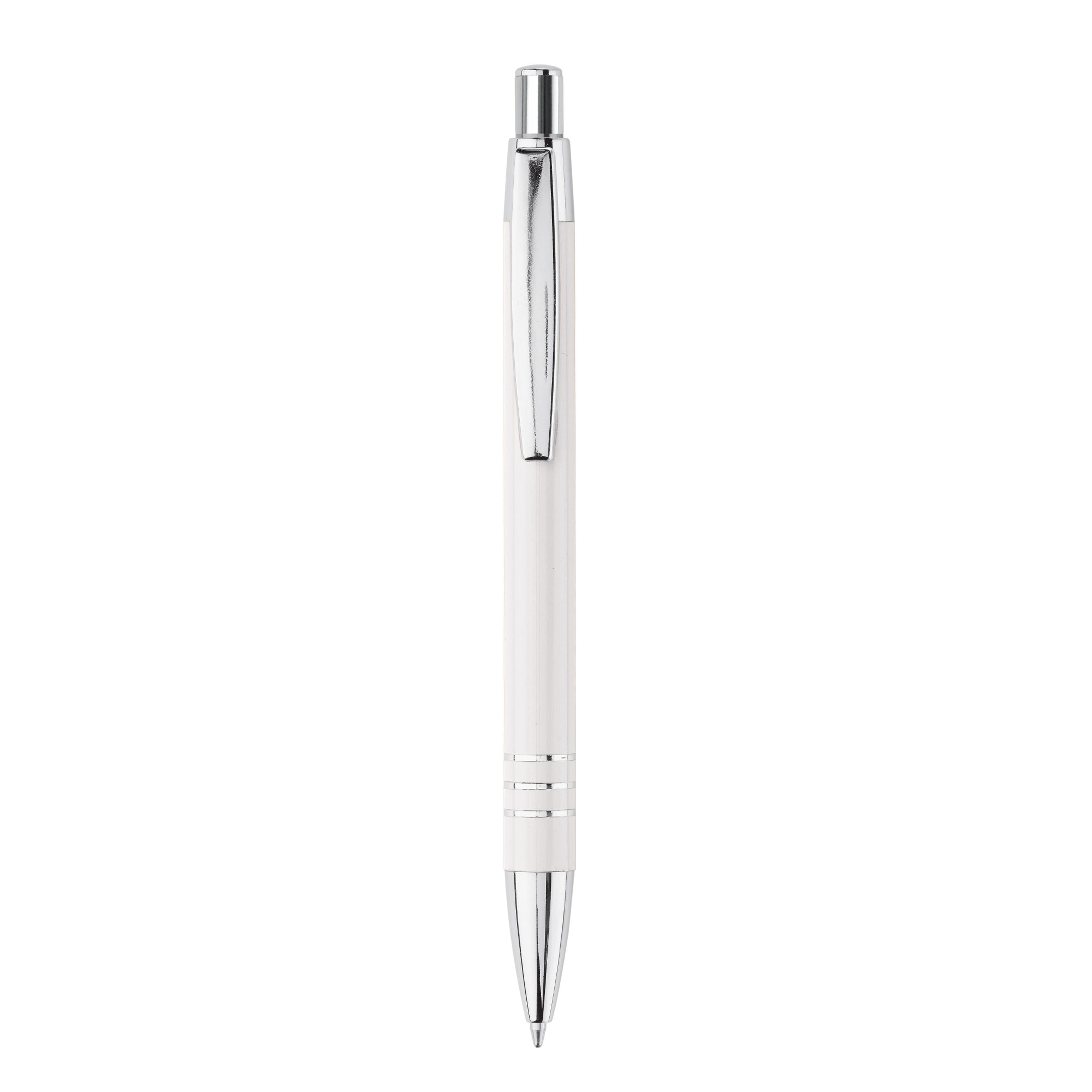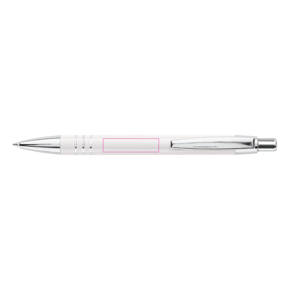 Aluminium Kugelschreiber mit 3 verchromten Ringen. Der Kugelschreiber ist in einem Aluminium Köcher verpackt.