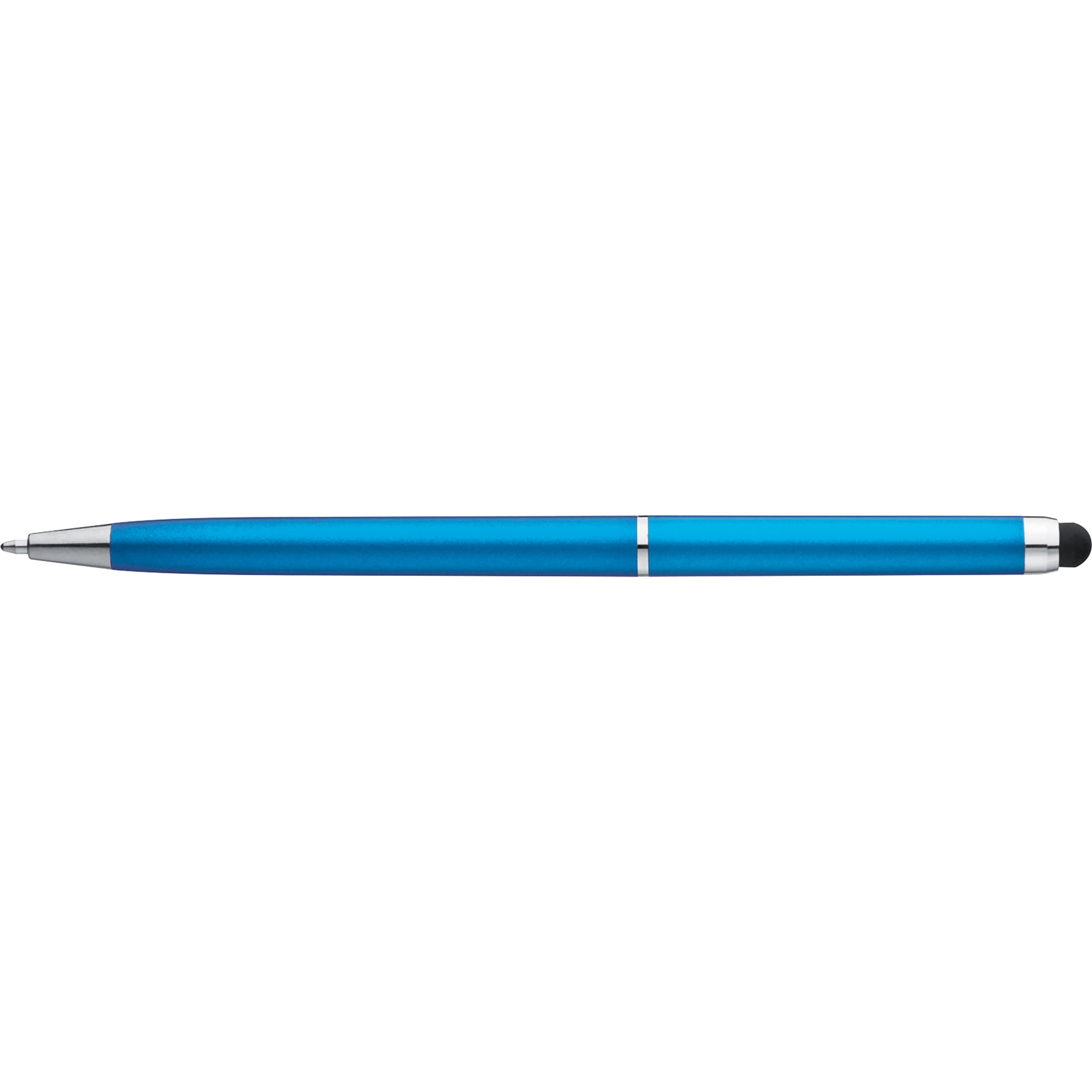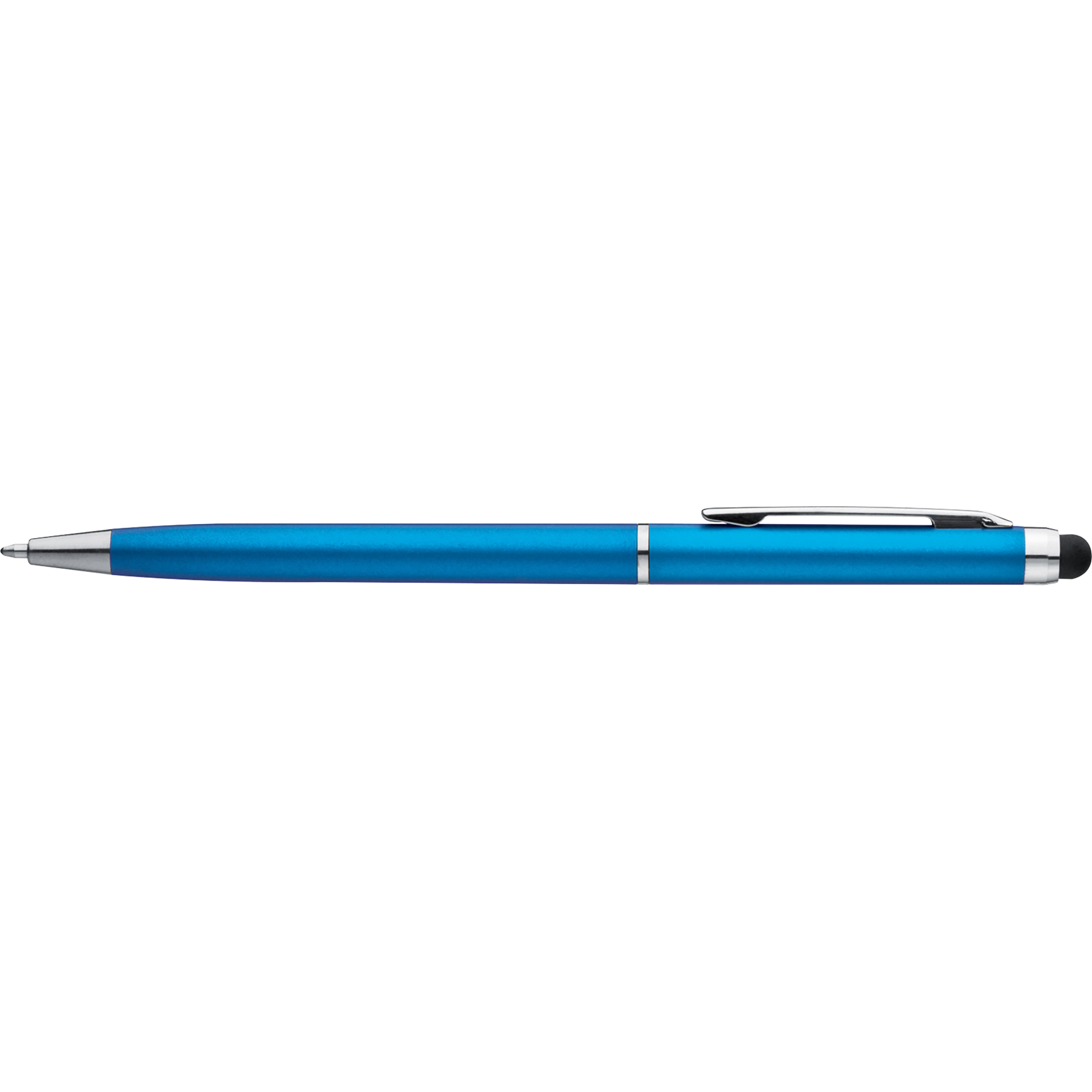 Drehkugelschreiber in eleganter schlanker Form mit blau schreibender Mine und praktischem Touch-Pad. Ihre Werbung drucken wir neben den Metallclip.