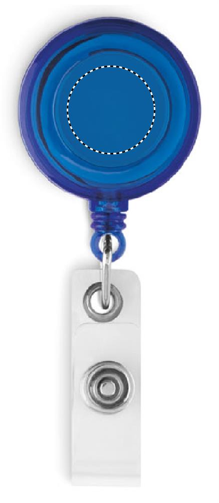 Transparenter Namensschildhalter mit Ausziehband: 50cm und Clip auf der Rückseite. Werbeanbringung mittels Doming.