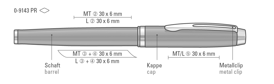 in Clipverlängerung 30mm x 6mm Lasergravur (L), in Clipverlängerung 30mm x 6mm Tampondruck (MT), gegenüber vom Clip 30mm x 6mm Lasergravur (L), gegenüber vom Clip 30mm x 6mm Tampondruck (MT), seitlich vom Clip 30mm x 6mm Lasergravur (L), seitlich vom Clip 30mm x 6mm Tampondruck (MT), auf der Kappe/auf dem Oberteil 30mm x 6mm Lasergravur (L), auf der Kappe/auf dem Oberteil 30mm x 6mm Tampondruck (MT), in Clipverlängerung 30mm x 6mm Einzelnamensgravur (EL), gegenüber vom Clip 30mm x 6mm Einzelnamensgravur (EL), seitlich vom Clip 30mm x 6mm Einzelnamensgravur (EL), auf der Kappe/auf dem Oberteil 30mm x 6mm Einzelnamensgravur (EL)