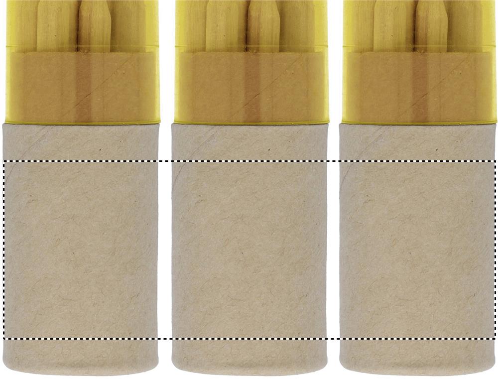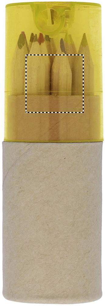 12 Buntstifte in einer runden Schachtel aus recyceltem Papier. Transparenter Deckel mit Bleistiftanspitzer.