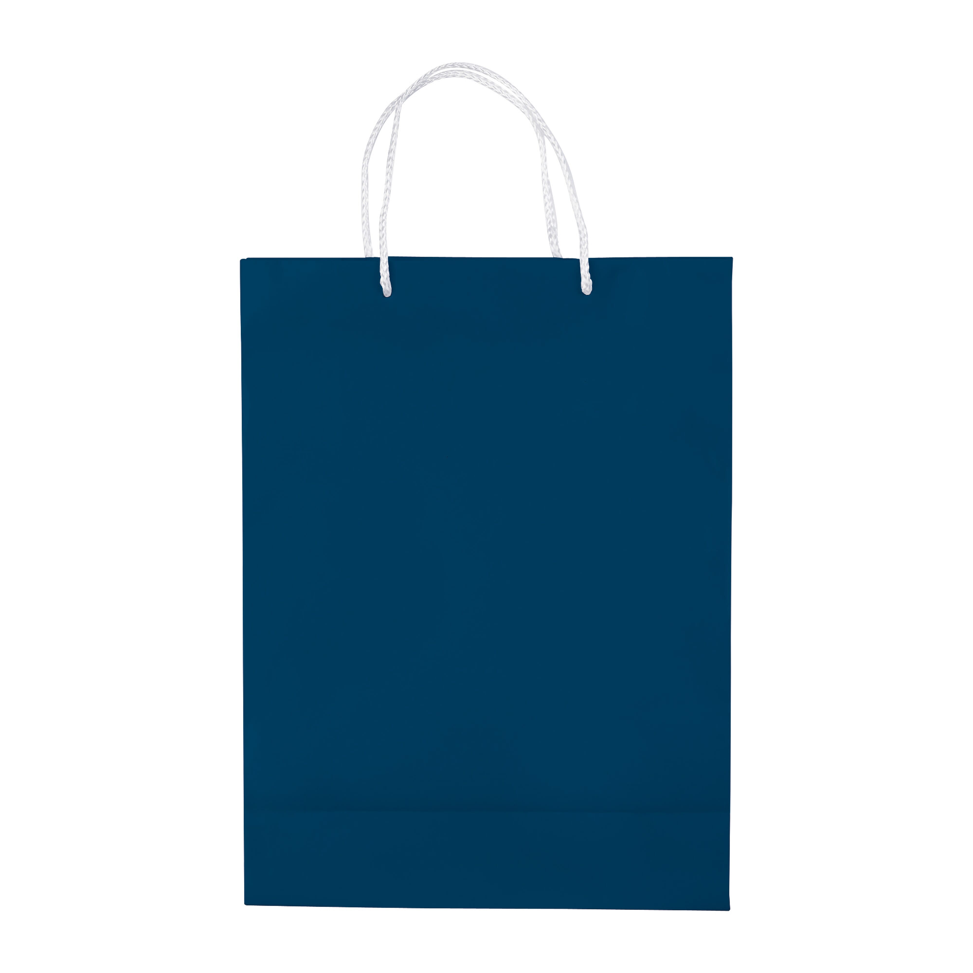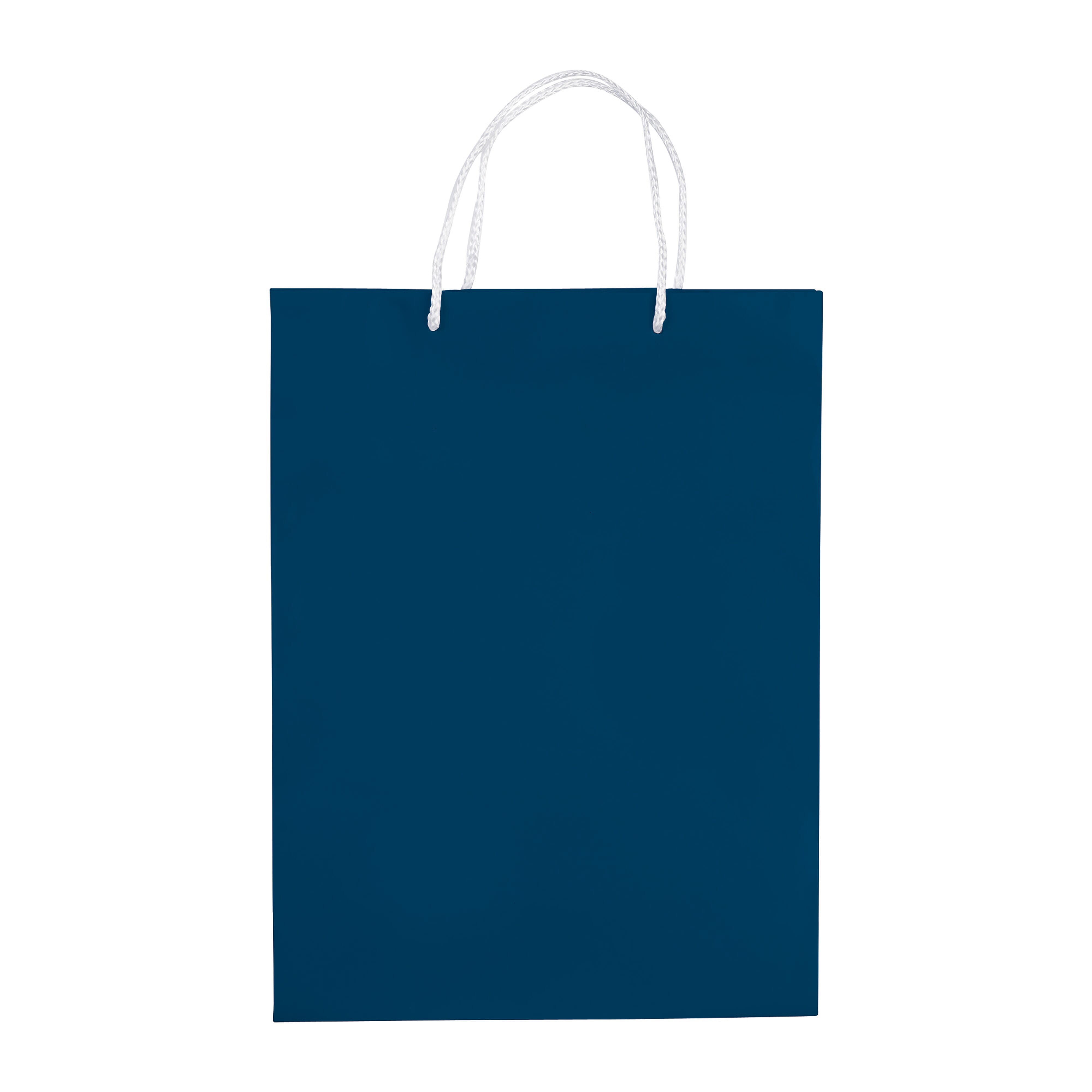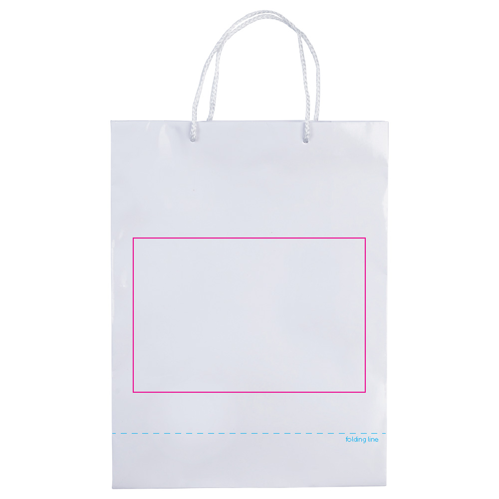 Große Papiertüte mit Seilgriffen. Erhältlich in mehreren Farben mit weißen/schwarzen Griffen. Große Druckfläche auf beiden Seiten. Starke Tasche. Glänzende Laminierung.