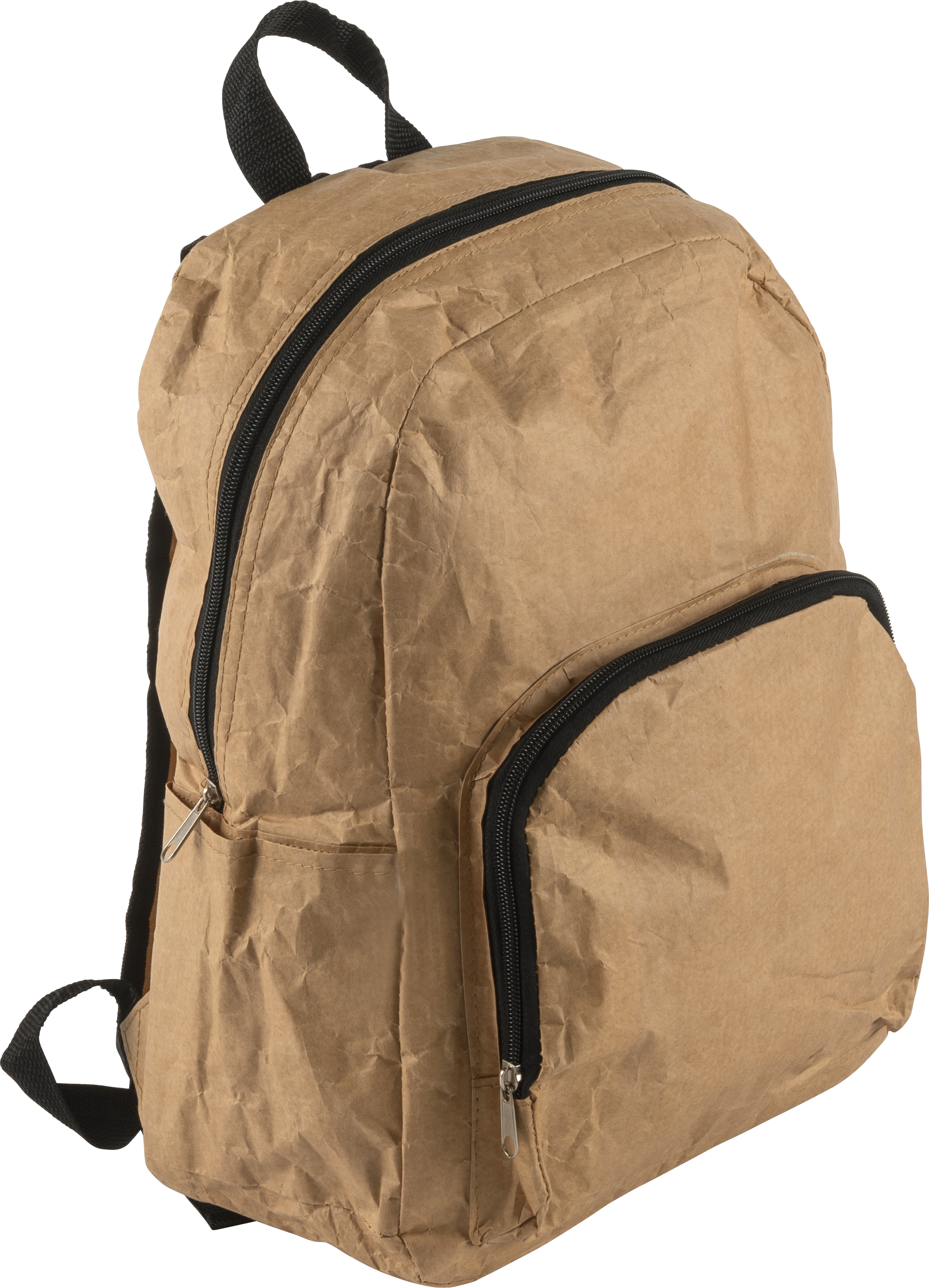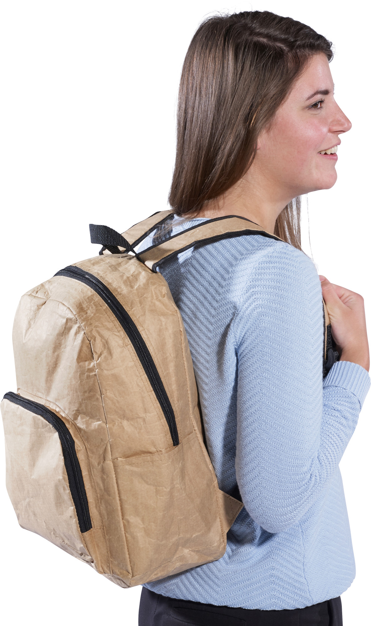 Laminierter Papier Rucksack “Mate“ mit einer silberfarbigen Folie, die der Isolierfunktion dient. Die große Tasche hat einen Reißverschluss, sowie die kleine Tasche vorne. Die Schultergurte sind verstellbar.