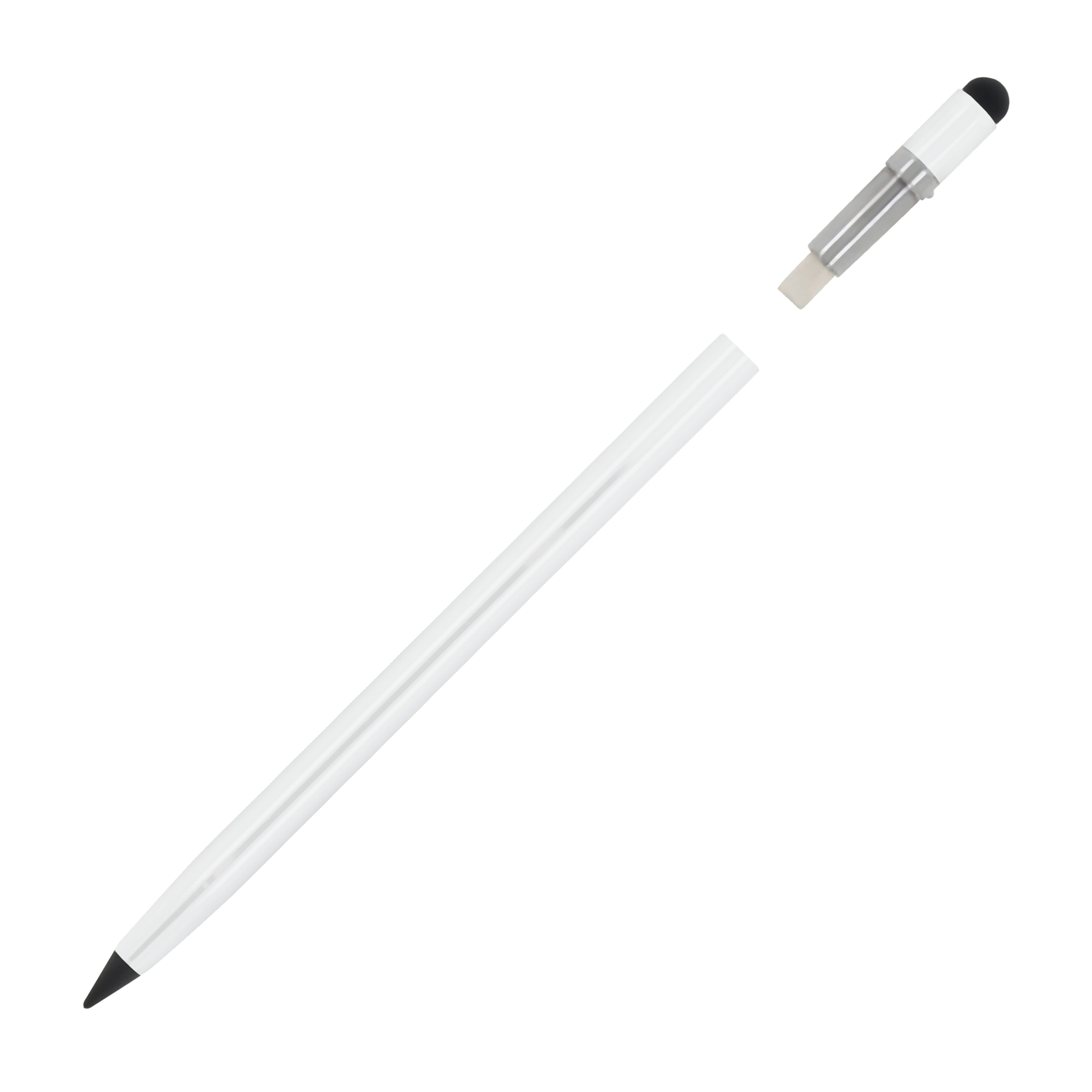 Aluminiumbleistift mit Radiergummi als Ersatz für den herkömmlichen Bleistift. Dieser langlebige Bleistift hat eine Graphitspitze. Er schreibt wie ein herkömmlicher Bleistift und kann auch ausradiert werden. Die Spitze muss nicht angespitzt werden und nutzt sich sehr langsam ab, wodurch der Bleistift bis zu 100 Mal länger hält als ein herkömmlicher Bleistift.