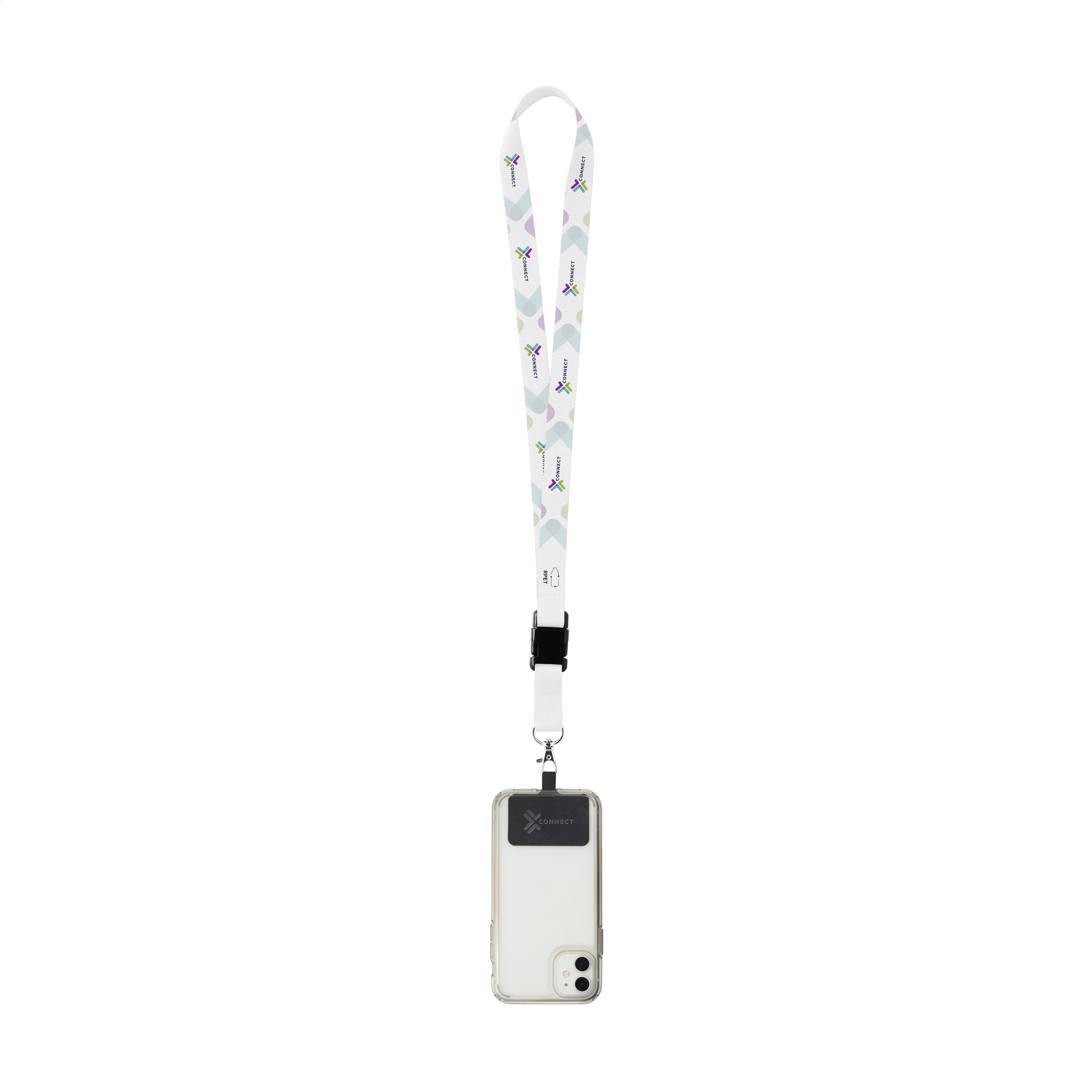 Schlüsselband aus starkem, gewebtem RPET-Polyester (hergestellt aus recycelten PET-Flaschen). Mit Karabinerhaken aus Metall und einem universellen Patch. Der untere Teil lässt sich durch ein Klicksystem aus Kunststoff abtrennen. Mit dem Patch können Sie Ihr Smartphone an Ihrem Schlüsselband befestigen. Mit dieser Kombination tragen Sie Ihr Smartphone sicher um Ihren Hals. So haben Sie Ihr Mobiltelefon schnell zur Hand und halten Ihre Taschen und Hände frei. Das Patch ist mit den meisten Kombinationen aus Smartphone und Hülle kompatibel, außer mit Hüllen mit offener Unterseite. Das System ist so konzipiert, dass es den Ladeanschluss des Telefons nicht blockiert, selbst wenn es am Schlüsselband befestigt ist. Inklusive Vollfarbsublimationsdruck auf dem Schlüsselband. Made in Europe.