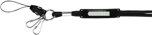 Lanyard aus Polyester, mit Handybefestigung, verschiebbarem PVC-Label für die Werbeanbringung, zwei Metall-Klemmen und Sicherheitsverschluss.