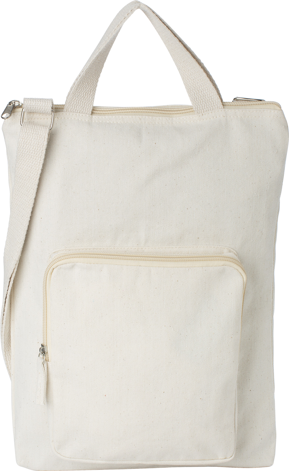 Laptoptasche aus Baumwolle (340 g/m²) (15 Zoll). Ein großes Fach mit Reißverschluss, kleine Fronttasche mit Reißverschluss. Zwei kurze Griffe und ein verstellbarer Schultergurt.