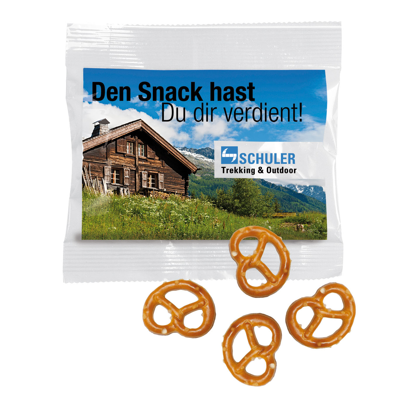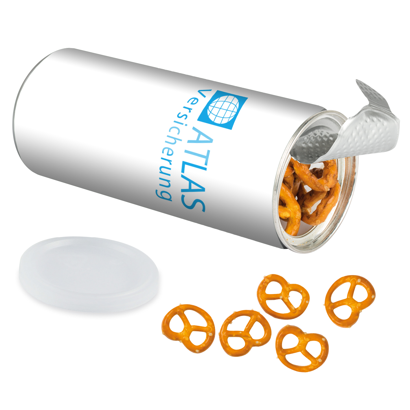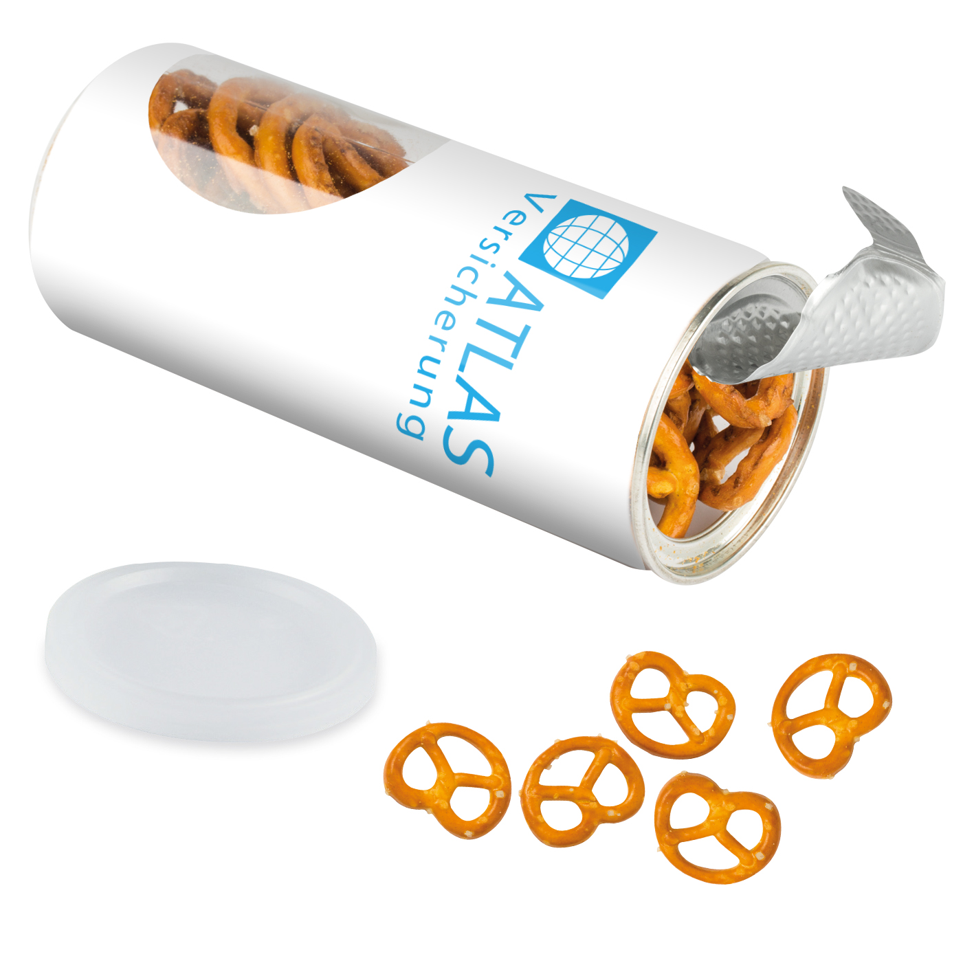 Produkt: PET-Dose, farblos-transparent mit Alu-Aufreißdeckel und transparentem Sleeve, individuell bedruckt sowie zusätzlichem Kunststoffdeckel zum br>Wiederverschließen br>Inhalt: Mini-Salz-Brezeln, ca. 45 g br>Haltbarkeit: 6 Monate br>Preise: € / Stück inkl. 4-c Digitaldruck auf Sleeve zzgl. Drucknebenkosten.