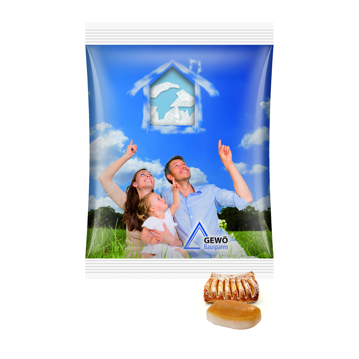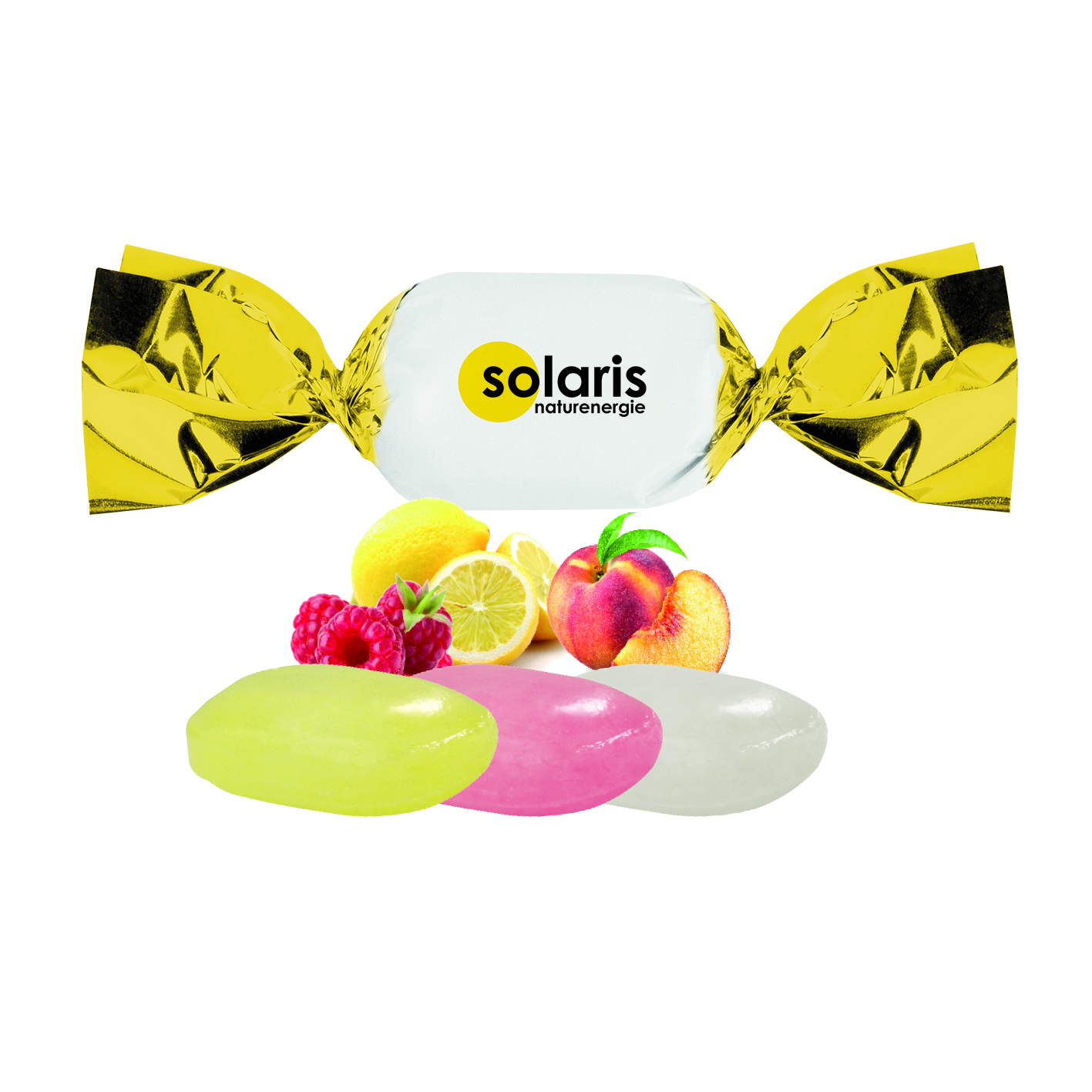 Produkt: Bonbon, im Wickler aus weißer Folie, individuell bedruckt. Ungefüllt (ca. 210 St. / kg, Ausnahme Vollmilch-Karamell ca. 200 St. / kg) Gefüllt (ca. 200 St. / kg) br>Sondergeschmacksrichtungen: Sind ab einer Mindestmenge von 300 kg auf Anfrage möglich br>Haltbarkeit: 24 Monate br>Preise: € / kg inkl. 3-c-Flexodruck zzgl. Drucknebenkosten.