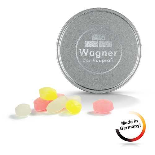 Produkt: Scharnierdeckel-Dose mit gewölbtem Deckel, weiß aus Metall, individuell bedruckt, mit Originalitätsverschluss und Aufreißperforation br>Inhalt: Mentos Kaubonbon in der Geschmacksrichtung Mint, ca. 25 g br>Haltbarkeit: 12 Monate br>Preise: € / Stück inkl. 4-c Tampondruck zzgl. Drucknebenkosten.