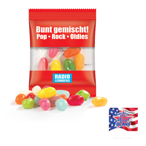 Produkt: Tüte aus weißer Folie, individuell bedruckt br>Inhalt: Jelly Beans der Marke American Style, bunt gemischt, ca. 10 g br>Haltbarkeit: 12 Monate br>Preise: € / Tüte inkl. 1-c Flexodruck zzgl. Drucknebenkosten.