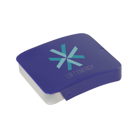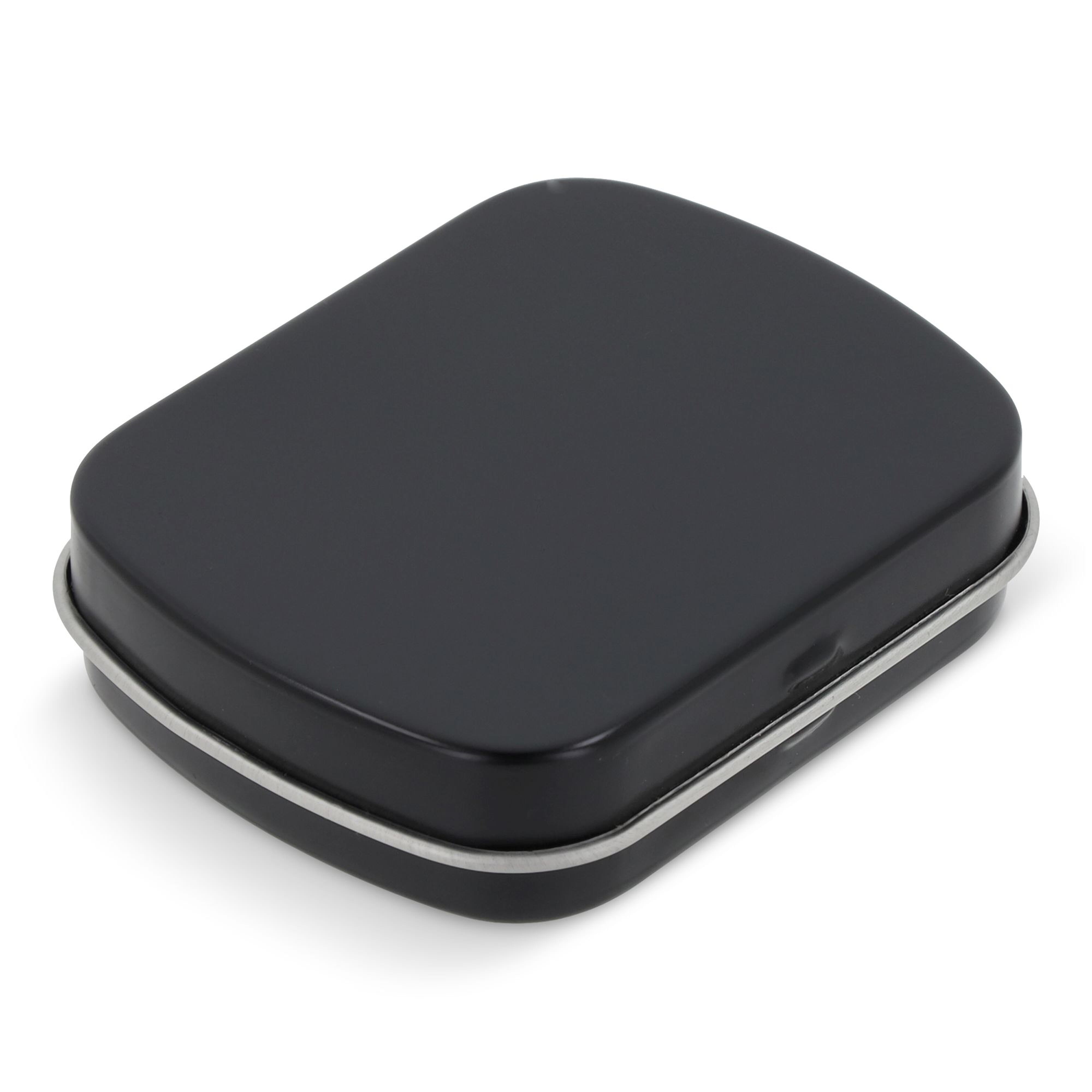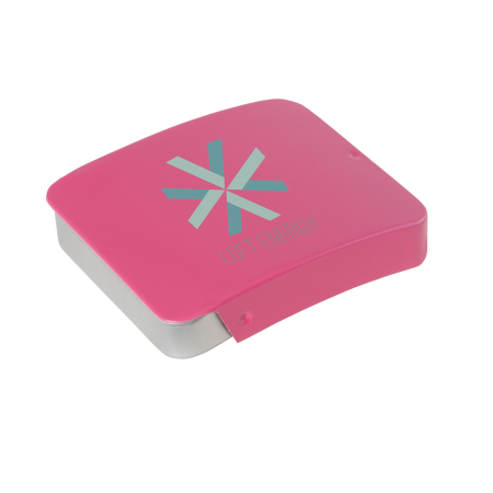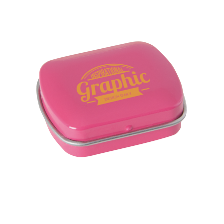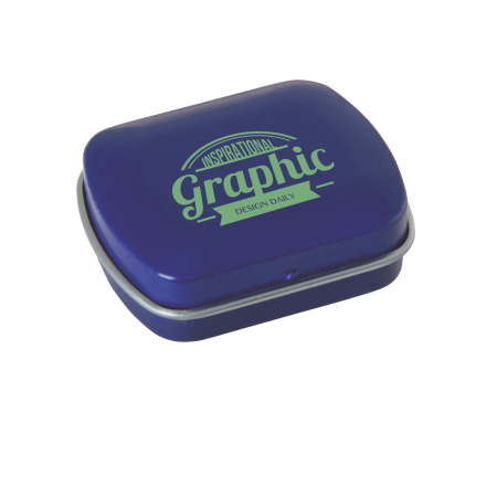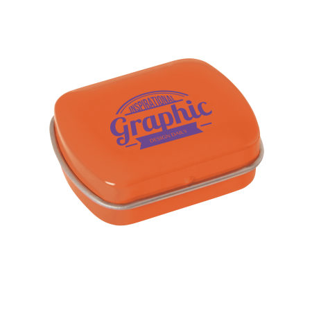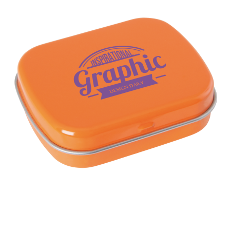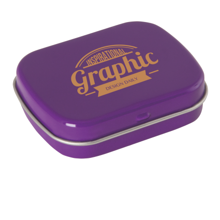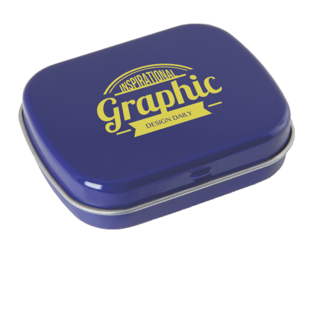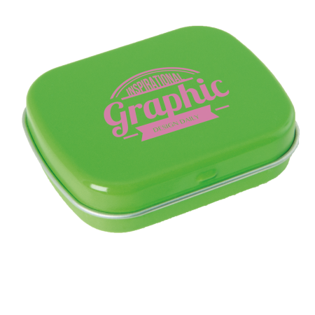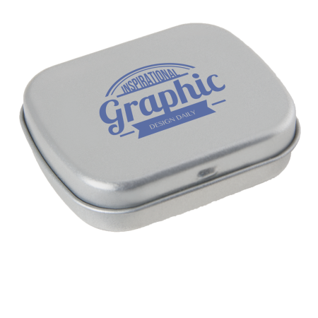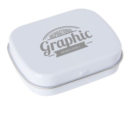 Metalldose - flacher Klappdeckel 40x33x12 mm mit ca. 10 gr. Pfefferminz. Diese rechteckige Pfefferminzdose hat einen gewölbten Klappdeckel. Ihre Werbung drucken wir 1-4 farbig mittels Tampondruck auf dem Deckel in einer maximalen Größe von 28 x 18 mm. Diese Pfefferminzdose ist befüllt mit Pfefferminzdragees mit feinstem erfrischendem Minzgeschmack. Sie können nach Belieben den Geschmack der Minzdragees selbst wählen und konfigurieren. Wählen Sie zwischen den Sorten süßer Pfefferminzgeschmack (gesüßt mit Dextrose) oder erfrischender Minzgeschmack zuckerfrei. Unsere Pfefferminzdosen mit Ihrem Logo haben auf der Unterseite der Mintboxen einen Zutatenaufkleber. Auf diesem sind sämtliche vorgeschriebene Inhaltsangaben enthalten. Alle Pfefferminzbonbons haben eine Mindesthalbarkeit von 12-18 Monaten bei sachgerechter Lagerung. Die frischen Minzpastillen sind am Rand mit einer Folie verschweißt. So erhält der Kunde einen sicheren Erstzugriff.