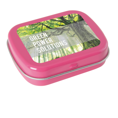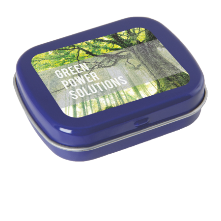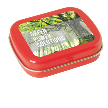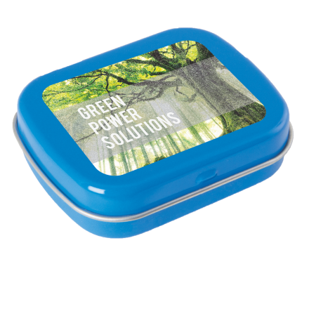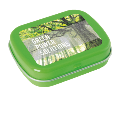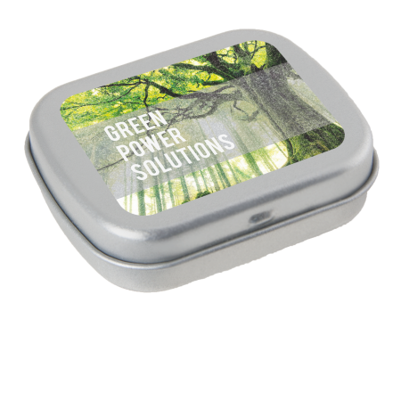Metalldose - flacher Klappdeckel 62x50x17 mm mit ca. 25 gr. Pfefferminzpastillen. Diese rechteckige Pfefferminzdose hat einen flachen Klappdeckel. Ihre Werbung drucken wir vollfächig auf dem Deckel in einer maximalen Größe von 62 x 50 mm Durchmesser. Der Digitaldruck wird über die gesamte Fläche des Deckels bedruckt. Es können mehrfarbige Motive oder aber auch Bildmotive mit Farbveräufen bedruckt werden. Diese Pfefferminzdose ist befüllt mit Pfefferminzdragees mit feinstem erfrischendem Minzgeschmack. Sie können nach Belieben den Geschmack der Minzdragees selbst wählen und konfigurieren. Wählen Sie zwischen den Sorten süßer Pfefferminzgeschmack (gesüßt mit Dextrose) oder erfrischender Minzgeschmack zuckerfrei. Unsere Pfefferminzdosen mit Ihrem Logo haben auf der Unterseite der Mintboxen einen Zutatenaufkleber. Auf diesem sind sämtliche vorgeschriebene Inhaltsangaben enthalten. Alle Pfefferminzbonbons haben eine Mindesthalbarkeit von 12-18 Monaten bei sachgerechter Lagerung. Die frischen Minzpastillen sind am Rand mit einer Folie verschweißt. So erhält der Kunde einen sicheren Erstzugriff.