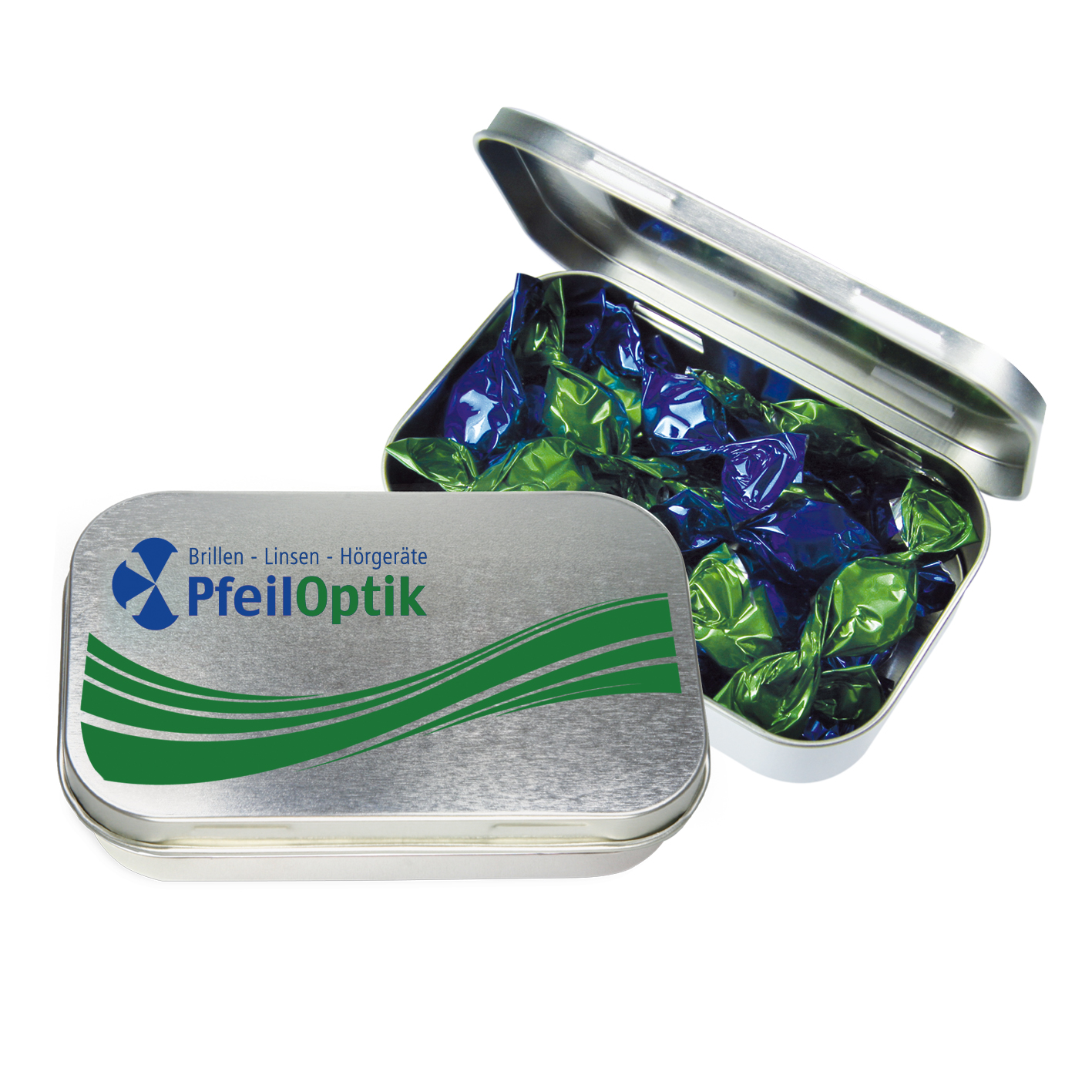 Metalldose - flacher Klappdeckel 95x60x21 mm mit ca. 10 gr. Pfefferminz. Diese rechteckige Pfefferminzdose hat einen flachen Klappdeckel. Ihre Werbung drucken wir 1-4 farbig mittels Tampondruck auf dem Deckel in einer maximalen Größe von 70 x 40 mm. Diese Pfefferminzdose ist befüllt mit Pfefferminzdragees mit feinstem erfrischendem Minzgeschmack. Sie können nach Belieben den Geschmack der Minzdragees selbst wählen und konfigurieren. Wählen Sie zwischen den Sorten süßer Pfefferminzgeschmack (gesüßt mit Dextrose) oder erfrischender Minzgeschmack zuckerfrei. Unsere Pfefferminzdosen mit Ihrem Logo haben auf der Unterseite der Mintboxen einen Zutatenaufkleber. Auf diesem sind sämtliche vorgeschriebene Inhaltsangaben enthalten. Alle Pfefferminzbonbons haben eine Mindesthalbarkeit von 12-18 Monaten bei sachgerechter Lagerung. Die frischen Minzpastillen sind am Rand mit einer Folie verschweißt. So erhält der Kunde einen sicheren Erstzugriff.