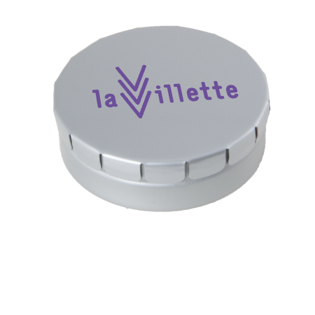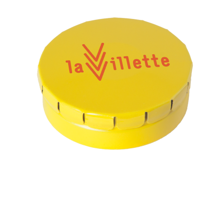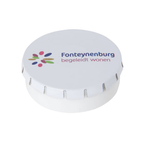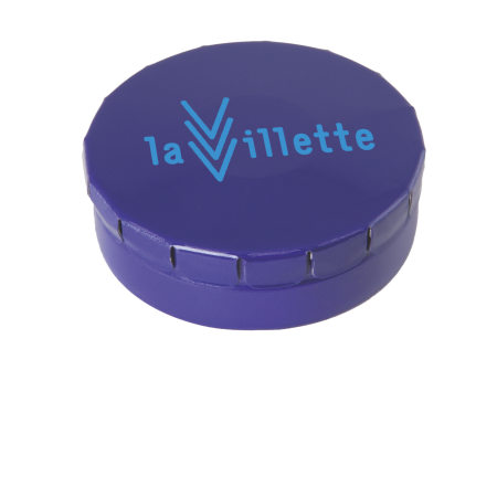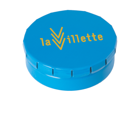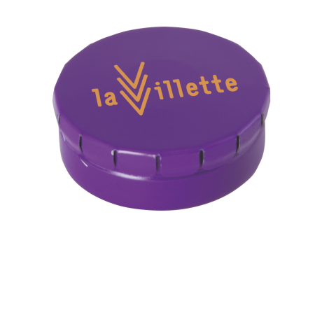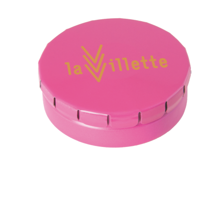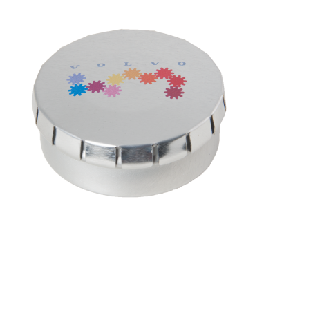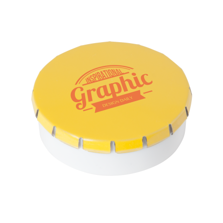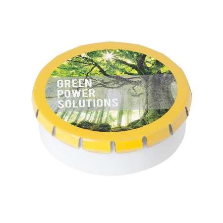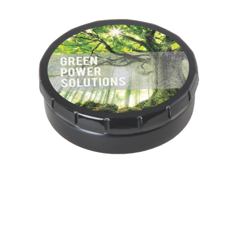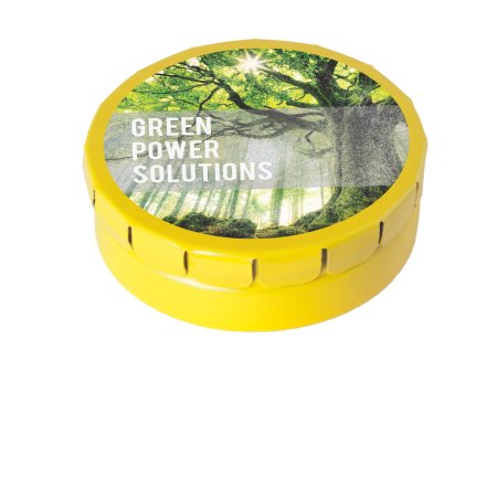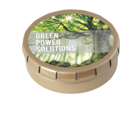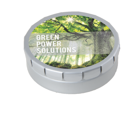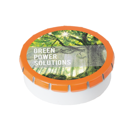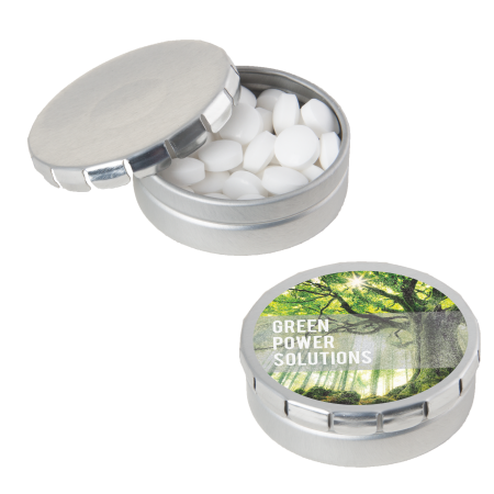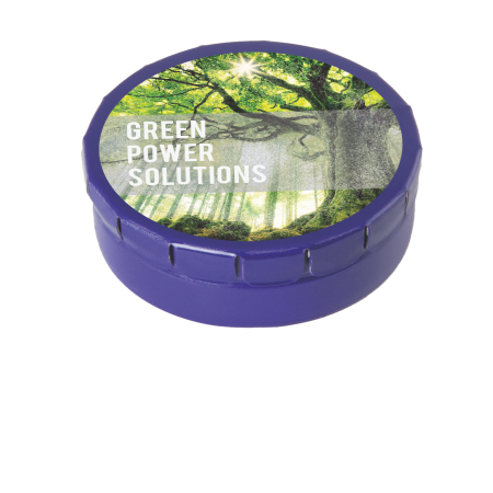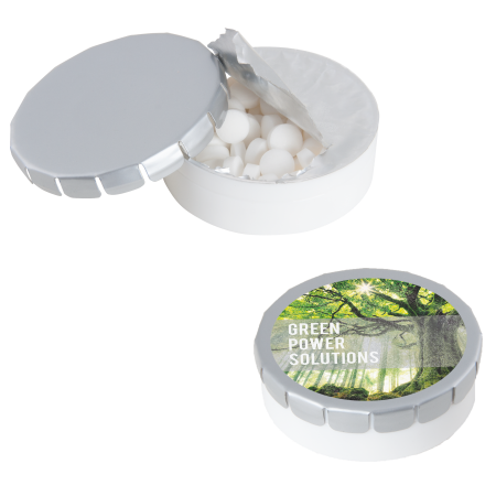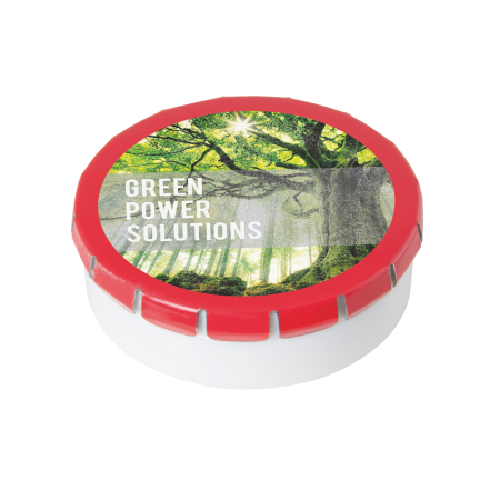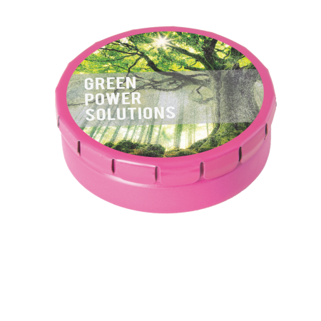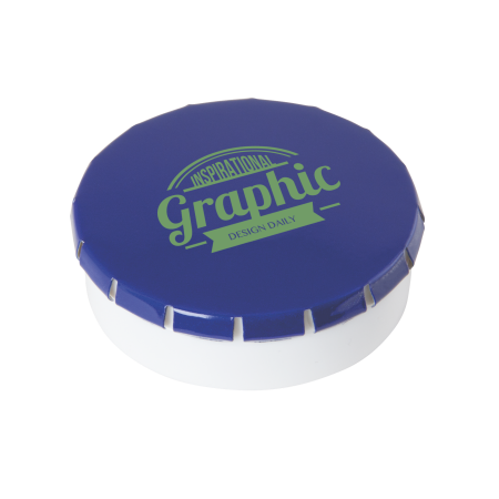 Klick Klack Metalldose mit Pfefferminz Pastillen - Diese Klick Klack Pfefferminz Metalldose hat die Maße Ø 45 mm x 15 mm und ist befüllt mit ca. 12 g Pfefferminzpastillen. Der tolle Effekt bei dieser Dose ist Klick Mechanismus des Springdeckels. Mittels Druck "klackt" der Deckel auf und man kann den Deckel entnehmen. Deshalb wird die Dose auch Drück mich Dose genannt. Zum verschließen wird der Deckel auf die Dose gelegt und einfach Druck auf die Seite des Deckels ausgeübt und der Deckel klackt wieder zu. Erhältlich ist diese Pfefferminzdose in einer großen Farbenvielfalt mit zwei verschiedenen Füllungen. Ihre Werbung drucken wir auf dem Deckel in einer maximalen Größe von 45mm Durchmesser. Der Digitaldruck wird vollfächig über die gesamte Fläche des Deckels bedruckt. Es können mehrfarbige Motive oder aber auch Bildmotive mit Farbveräufen bedruckt werden. Diese Pfefferminzdose ist befüllt mit Pfefferminzdragees mit feinstem erfrischendem Minzgeschmack. Sie können nach Belieben den Geschmack der Minzdragees selbst wählen und konfigurieren. Wählen Sie zwischen den Sorten süßer Pfefferminzgeschmack (gesüßt mit Dextrose) oder erfrischender Minzgeschmack zuckerfrei. Unsere Pfefferminzdosen mit Ihrem Logo haben auf der Unterseite der Mintboxen einen Zutatenaufkleber. Auf diesem sind sämtliche vorgeschriebene Inhaltsangaben enthalten. Alle Pfefferminzbonbons haben eine Mindesthalbarkeit von 12-18 Monaten bei sachgerechter Lagerung. Die frischen Minzpastillen sind am Rand mit einer Folie verschweißt. So erhält der Kunde einen sicheren Erstzugriff.