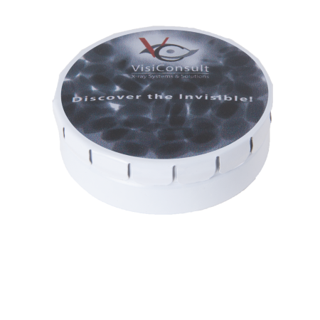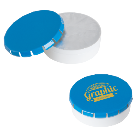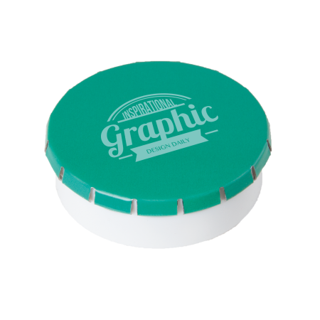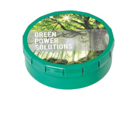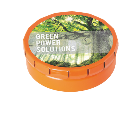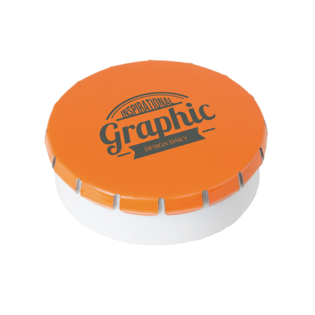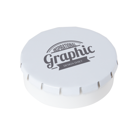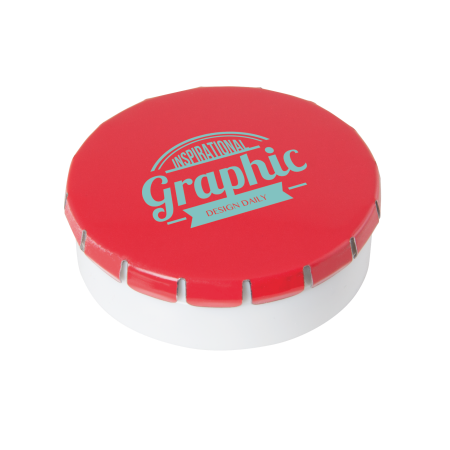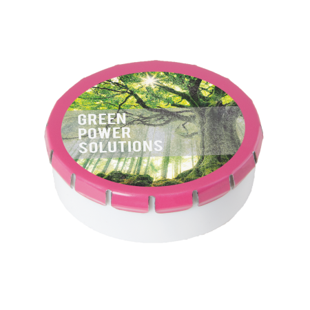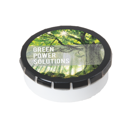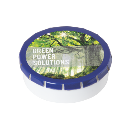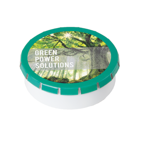 Klick Klack Dose Pfefferminz Ø 53 mm x 18 mm mit ca. 25 gr. Diese Klick Klack Dose hat die Maße Ø 53 mm x 18 mm und ist befüllt mit ca. 25 g Pfefferminzpastillen. Der tolle Effekt bei dieser Dose ist der Klick Mechanismus des Deckels. Mittels Druck "klackt" der Deckel auf und man kann den Deckel entnehmen. Zum verschließen wird der Deckel auf die Dose gelegt und einfach Druck auf die Seite des Deckels ausgeübt und der Deckel klackt wieder zu. Erhältlich ist diese Pfefferminzdose in einer großen Farbenvielfalt mit zwei verschiedenen Füllungen. Ihre Werbung drucken wir auf dem Deckel in einer maximalen Größe von 52 mm Durchmesser. Der Digitaldruck wird vollflächig über die gesamte Fläche des Deckels bedruckt. Es können mehrfarbige Motive oder aber auch Bildmotive mit Farbverläufen bedruckt werden. Diese Pfefferminzdose ist befüllt mit Pfefferminzdragees mit feinstem erfrischendem Minzgeschmack. Sie können nach Belieben den Geschmack der Minzdragees selbst wählen und konfigurieren. Wählen Sie zwischen den Sorten süßer Pfefferminzgeschmack (gesüßt mit Dextrose) oder erfrischender Minzgeschmack zuckerfrei. Unsere Pfefferminzdosen mit Ihrem Logo haben auf der Unterseite der Mintboxen einen Zutatenaufkleber. Auf diesem sind sämtliche vorgeschriebene Inhaltsangaben enthalten. Alle Pfefferminzbonbons haben eine Mindesthalbarkeit von 12-18 Monaten bei sachgerechter Lagerung. Die frischen Minzpastillen sind am Rand mit einer Folie verschweißt. So erhält der Kunde einen sicheren Erstzugriff.