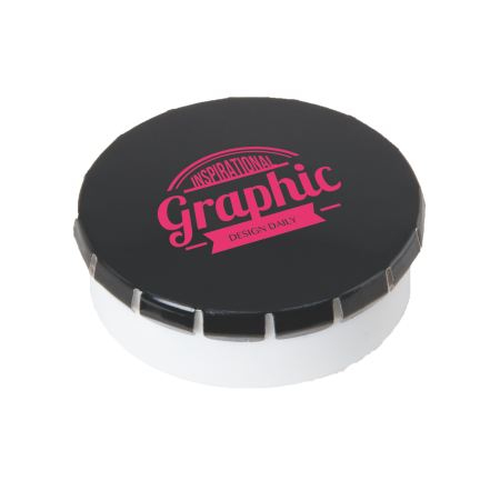 Klick Klack Dose Pfefferminz mit Metalldeckel - Diese Klick Klack Dose hat die Maße Ø 45 mm x 15 mm und ist befüllt mit ca. 12 g Pfefferminzpastillen. Der tolle Effekt bei dieser Dose ist der Klick Mechanismus des Springdeckels. Mittels Druck "klackt" der Deckel auf und man kann den Deckel entnehmen. Deshalb wird die Dose auch Drück mich Dose genannt. Zum verschließen wird der Deckel auf die Dose gelegt und einfach Druck auf die Seite des Deckels ausgeübt und der Deckel klackt wieder zu. Erhältlich ist diese Pfefferminzdose in einer großen Farbenvielfalt mit zwei verschiedenen Füllungen. Ihre Werbung drucken wir auf dem Deckel in einer maximalen Größe von 45mm Durchmesser. Der Digitaldruck wird vollflächig über die gesamte Fläche des Deckels bedruckt. Es können mehrfarbige Motive oder aber auch Bildmotive mit Farbverläufen bedruckt werden. Diese Pfefferminzdose ist befüllt mit Pfefferminzdragees mit feinstem erfrischendem Minzgeschmack. Sie können nach Belieben den Geschmack der Minzdragees selbst wählen und konfigurieren. Wählen Sie zwischen den Sorten süßer Pfefferminzgeschmack (gesüßt mit Dextrose) oder erfrischender Minzgeschmack zuckerfrei. Unsere Pfefferminzdosen mit Ihrem Logo haben auf der Unterseite der Mintboxen einen Zutatenaufkleber. Auf diesem sind sämtliche vorgeschriebene Inhaltsangaben enthalten. Alle Pfefferminzbonbons haben eine Mindesthalbarkeit von 12-18 Monaten bei sachgerechter Lagerung. Die frischen Minzpastillen sind am Rand mit einer Folie verschweißt. So erhält der Kunde einen sicheren Erstzugriff.