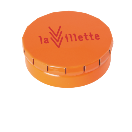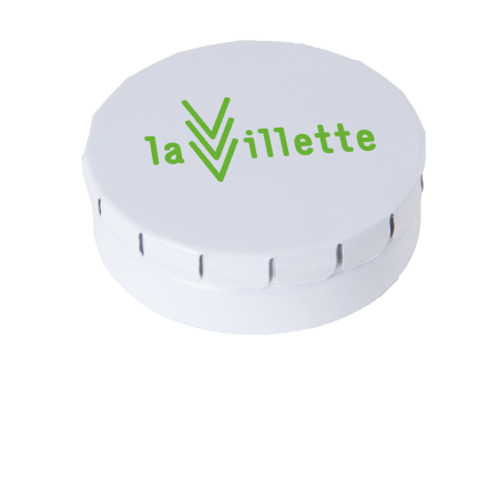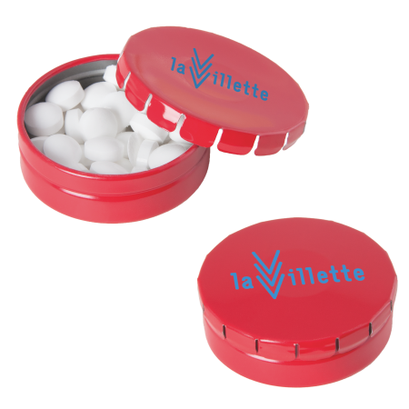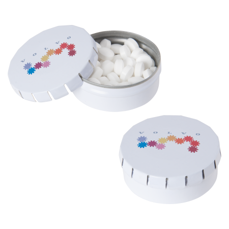 Klick Klack Metalldose mit Pfefferminz Pastillen - Diese Klick Klack Pfefferminz Metalldose hat die Maße Ø 45 mm x 15 mm und ist befüllt mit ca. 12 g Pfefferminzpastillen. Der tolle Effekt bei dieser Dose ist der Klick Mechanismus des Springdeckels. Mittels Druck "klackt" der Deckel auf und man kann den Deckel entnehmen. Deshalb wird die Dose auch Drück mich Dose genannt. Zum verschließen wird der Deckel auf die Dose gelegt und einfach Druck auf die Seite des Deckels ausgeübt und der Deckel klackt wieder zu. Erhältlich ist diese Pfefferminzdose in einer großen Farbenvielfalt mit zwei verschiedenen Füllungen. Ihre Werbung drucken wir auf dem Deckel in einer maximalen Größe von 40mm Durchmesser. Diese Pfefferminzdose ist befüllt mit Pfefferminzdragees mit feinstem erfrischendem Minzgeschmack. Sie können nach Belieben den Geschmack der Minzdragees selbst wählen und konfigurieren. Wählen Sie zwischen den Sorten süßer Pfefferminzgeschmack (gesüßt mit Dextrose) oder erfrischender Minzgeschmack zuckerfrei. Unsere Pfefferminzdosen mit Ihrem Logo haben auf der Unterseite der Mintboxen einen Zutatenaufkleber. Auf diesem sind sämtliche vorgeschriebene Inhaltsangaben enthalten. Alle Pfefferminzbonbons haben eine Mindesthalbarkeit von 12-18 Monaten bei sachgerechter Lagerung. Die frischen Minzpastillen sind am Rand mit einer Folie verschweißt. So erhält der Kunde einen sicheren Erstzugriff.