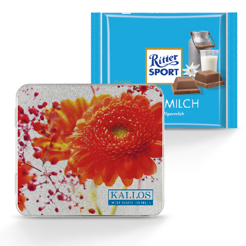 Produkt: Dose mit Scharnierdeckel, blank aus Metall, individuell bedruckt br>Inhalt: Eine 100 g-Tafel in den Sorten Nugat, Marzipan, Alpenmilch oder Joghurt. Weitere Sorten ab einer Mindestmenge von 1.000 Stück (100 g-Tafel) auf Anfrage. Nach Kundenwunsch sortenrein oder gemischt (im Karton immer sortenrein) br>Haltbarkeit: 6 Monate. br>Preise: € / Box inkl. 4-c Digitaldruck zzgl. Drucknebenkosten.