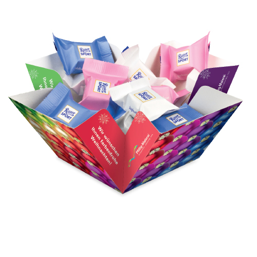 Produkt: Original Ritter SPORT Mini Schokolade mit Papierbanderole, individuell bedruckt br>Inhalt: Ritter SPORT Mini. Nach Kundenwunsch sortenrein oder gemischt (im Karton immer sortenrein), ca. 16,5 g br>Mindestmenge pro Geschmacksrichtung 250 Stück br>Haltbarkeit: 6 Monate br>Preise: € / Box inkl. 4-c Digitaldruck zzgl. Drucknebenkosten.